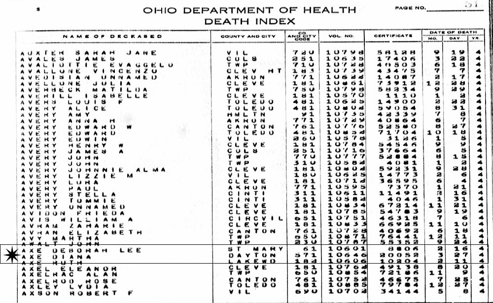 Died: March 27, 1944 in St. Marys, Auglaize County, Ohio. (Death Certificate #20052.)