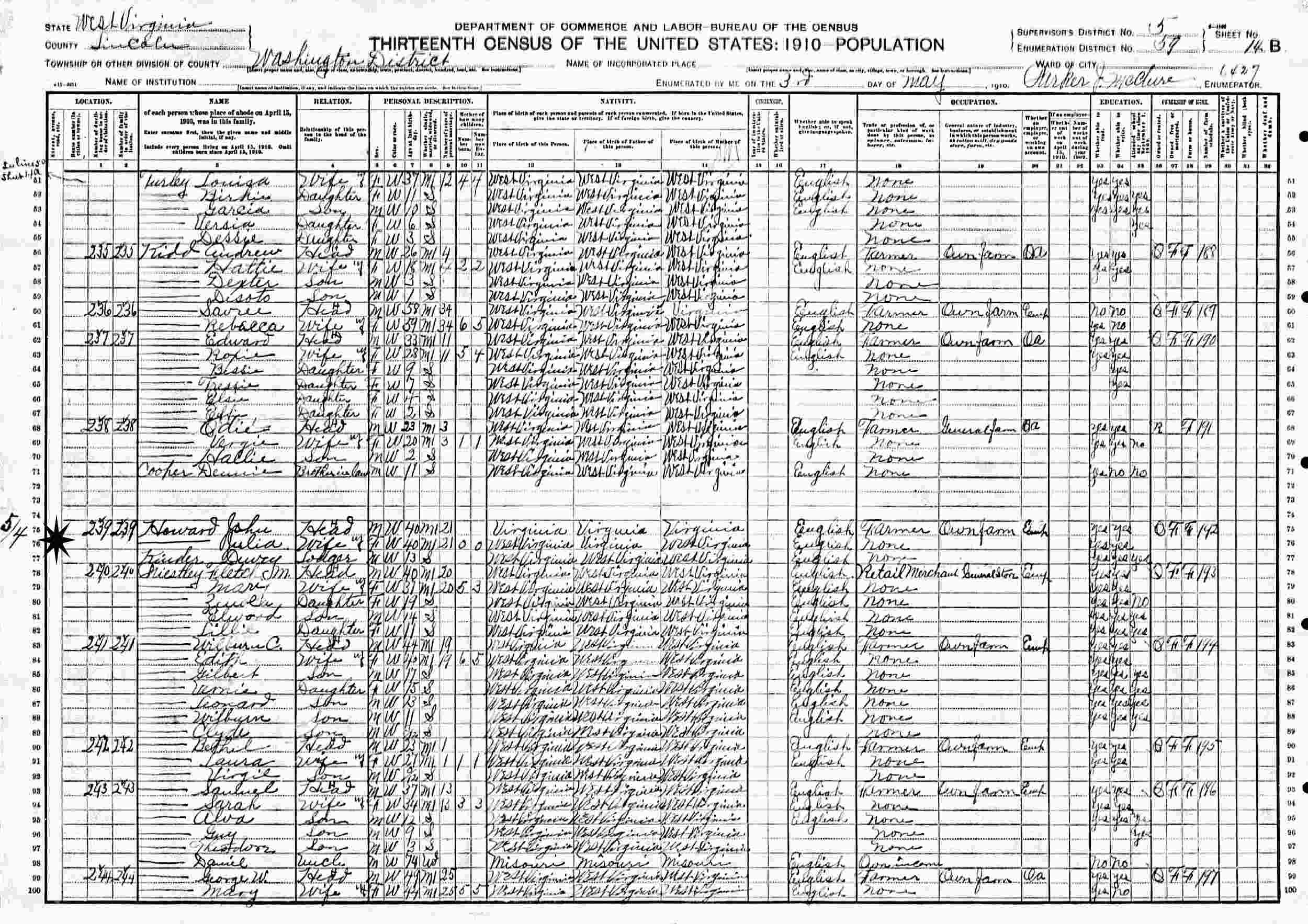 May 3-4, 1910 - Supervisor's District 5, Enumeration District 59, Washington District, Lincoln County, West Virginia (Lodger W/John and Julia Howard).