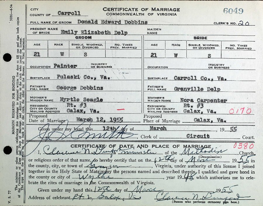 Married: Emily Elizabeth Delp March 12, 1955 in Galax, Virginia.