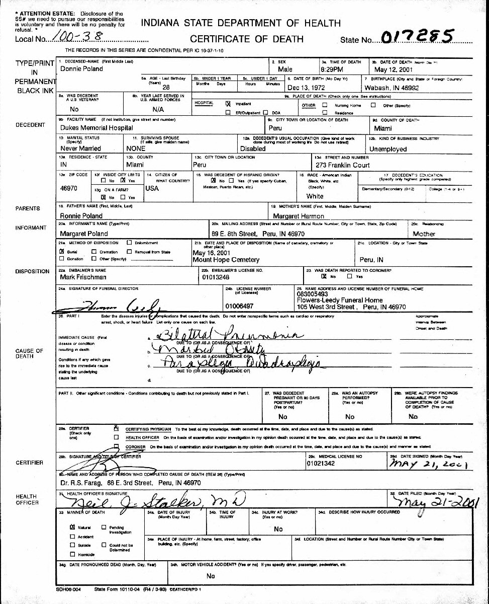 Died: May 21, 2001 in Peru, Miami County, Indiana.