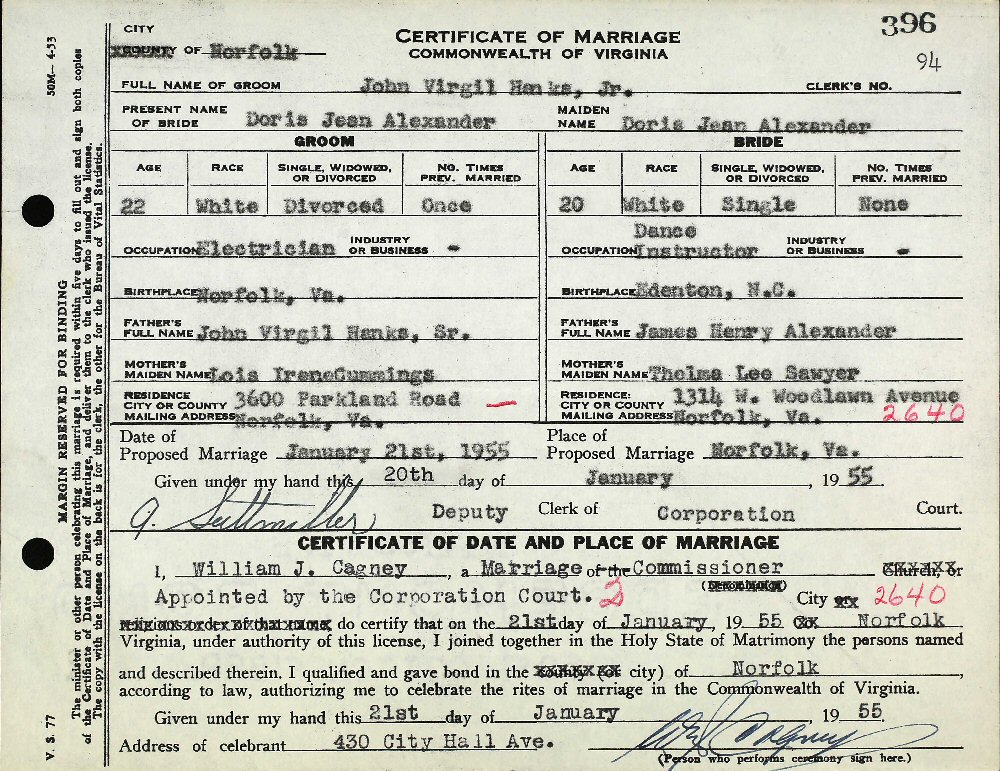 Married: John Virgil Hanks, Jr January 21, 1955 in Norfolk, Virginia.