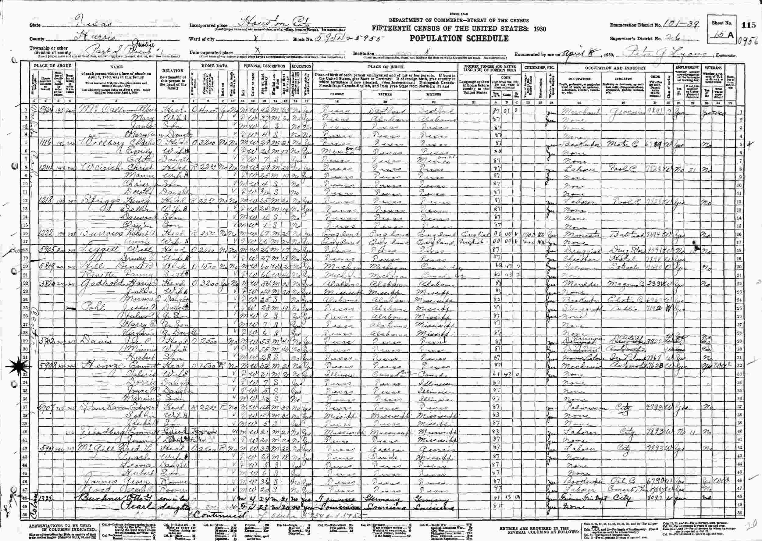 April 8, 1930 - 5908 Center, Justice Precinct 1, Block 5954-5955, Supervisor's District 26, Enumeration District 101-39, Houston, Harris County, Texas.