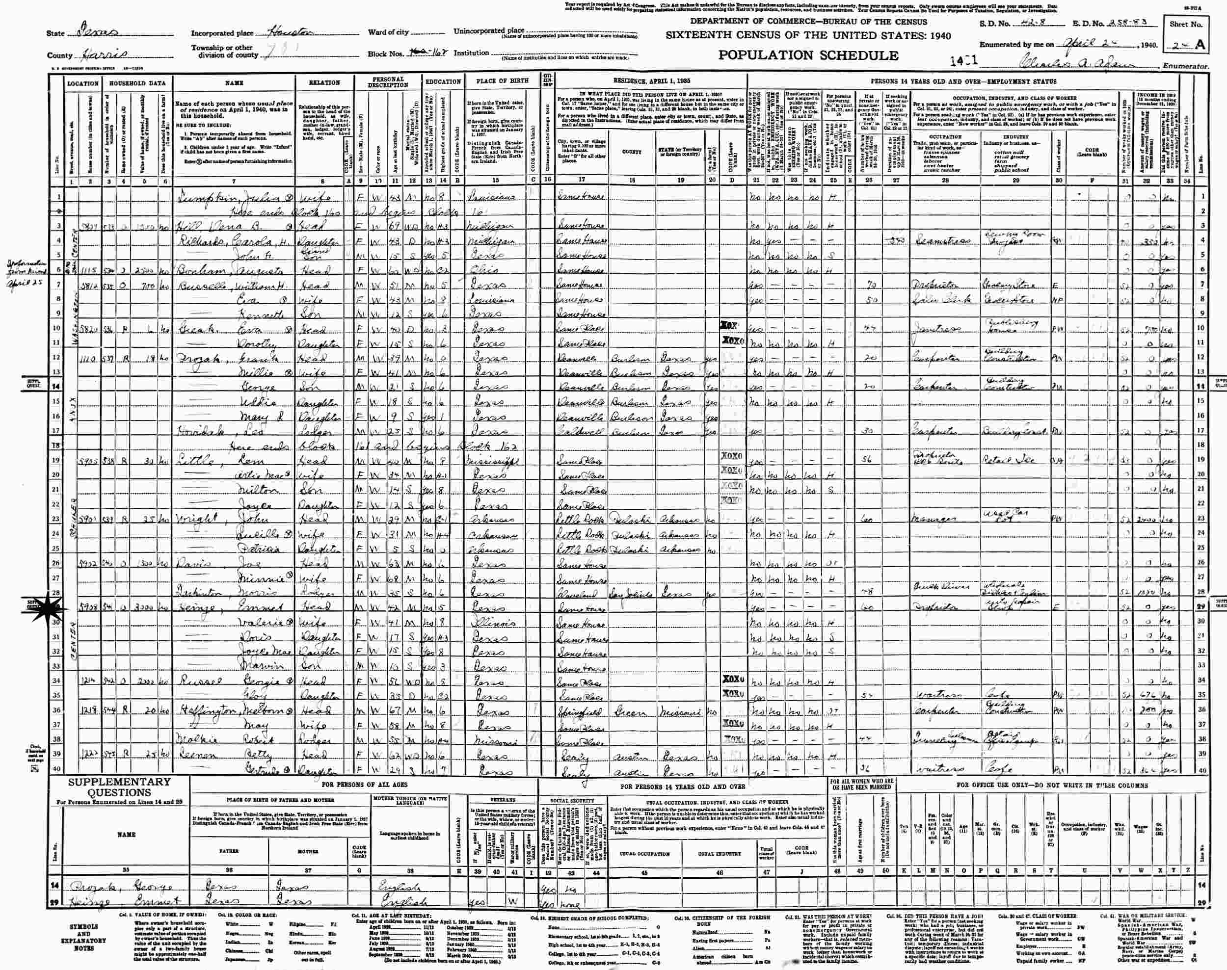April 24, 1940 - 5908 Center, Block 162, Supervisor's District 42-8, Enumeration District 258-83, Houston, Harris County, Texas.