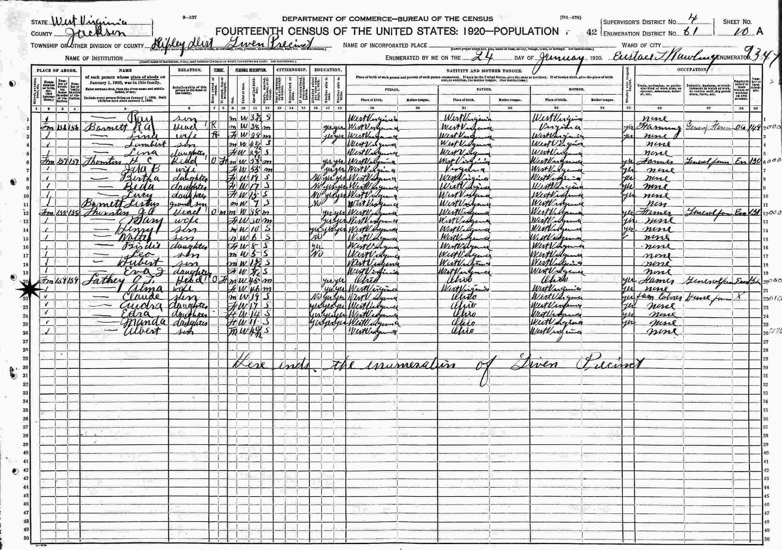 April 3, 1930 - Supervisor's District 27, Enumeration District 53-4, Lebanon Township, Meigs County, Ohio.