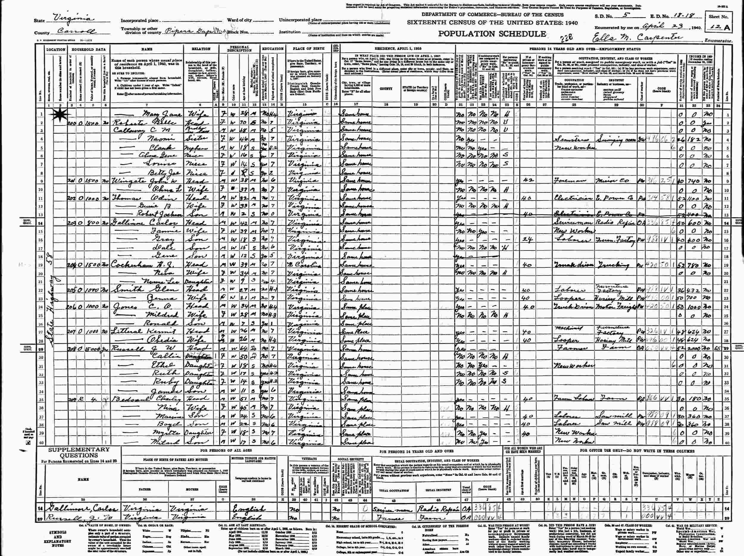 April 22-23, 1940 - State Highway 58, Supervisor's District 5, Enumeration District 18-18, Pipers Gap, Carroll County, Virginia.