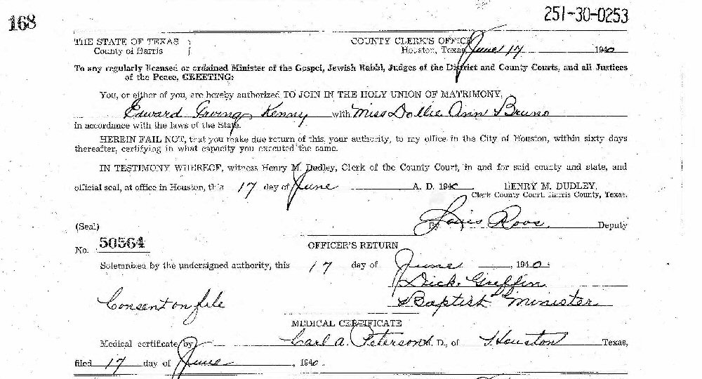 Married: Dollie Ann Bruno June 17, 1940 in Houston, Harris County, Texas.