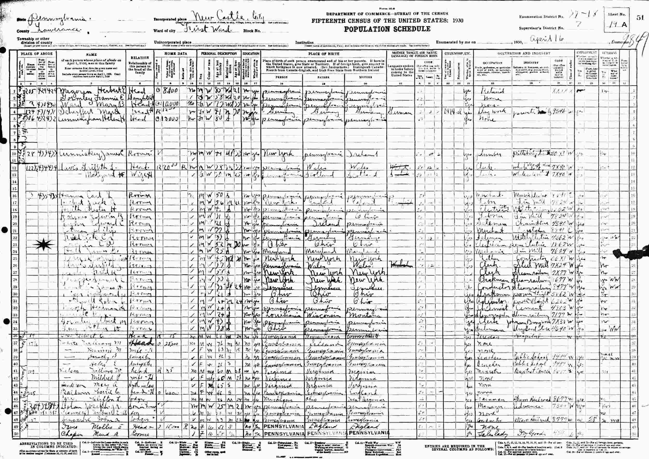 April 16, 1930 - First Ward, Supervisor's District 7, Enumeration District 77-18, New Castle City, Lawrence County, Pennsylvania (Roomer).