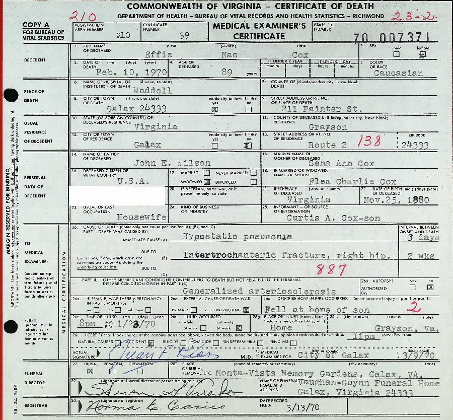 Died: February 10, 1970 in Waddell Nursing Home, Galax, Virginia.