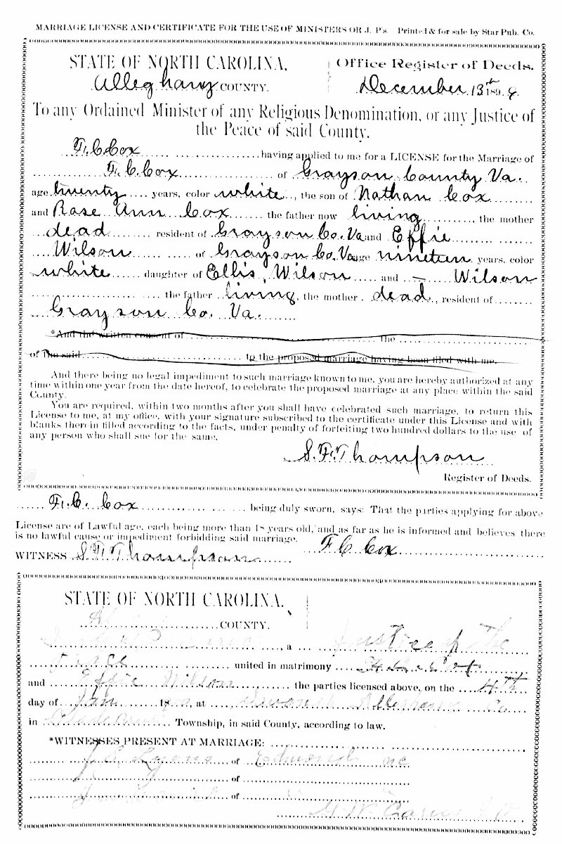 Married: Flemming Charlie "Flem" Cox January 4, 1900 in Alleghany County, North Carolina.