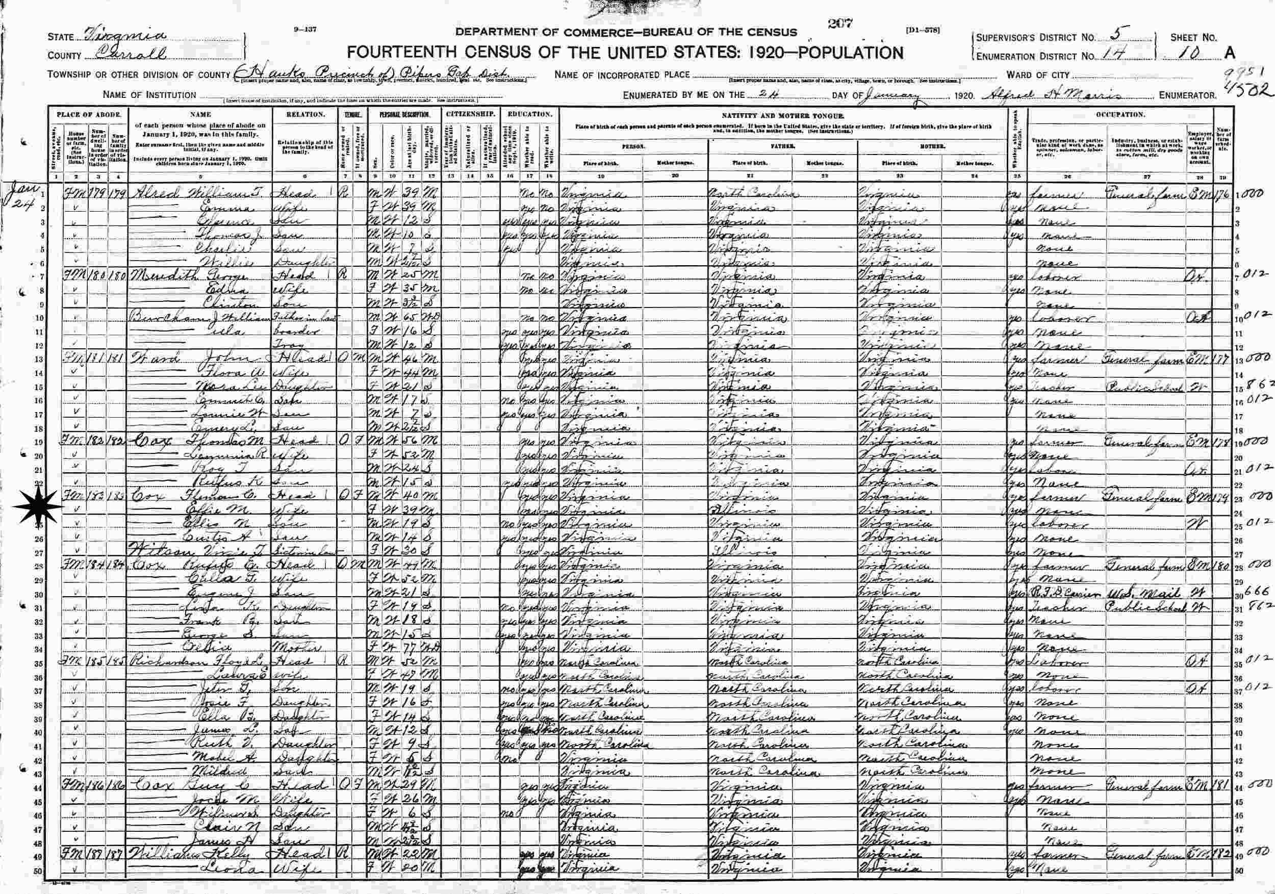 January 24, 1920 - Hanks Precinct, Pipers Gap District, Supervisor's District 5, Enumeration District 14, Carroll County, Virginia.