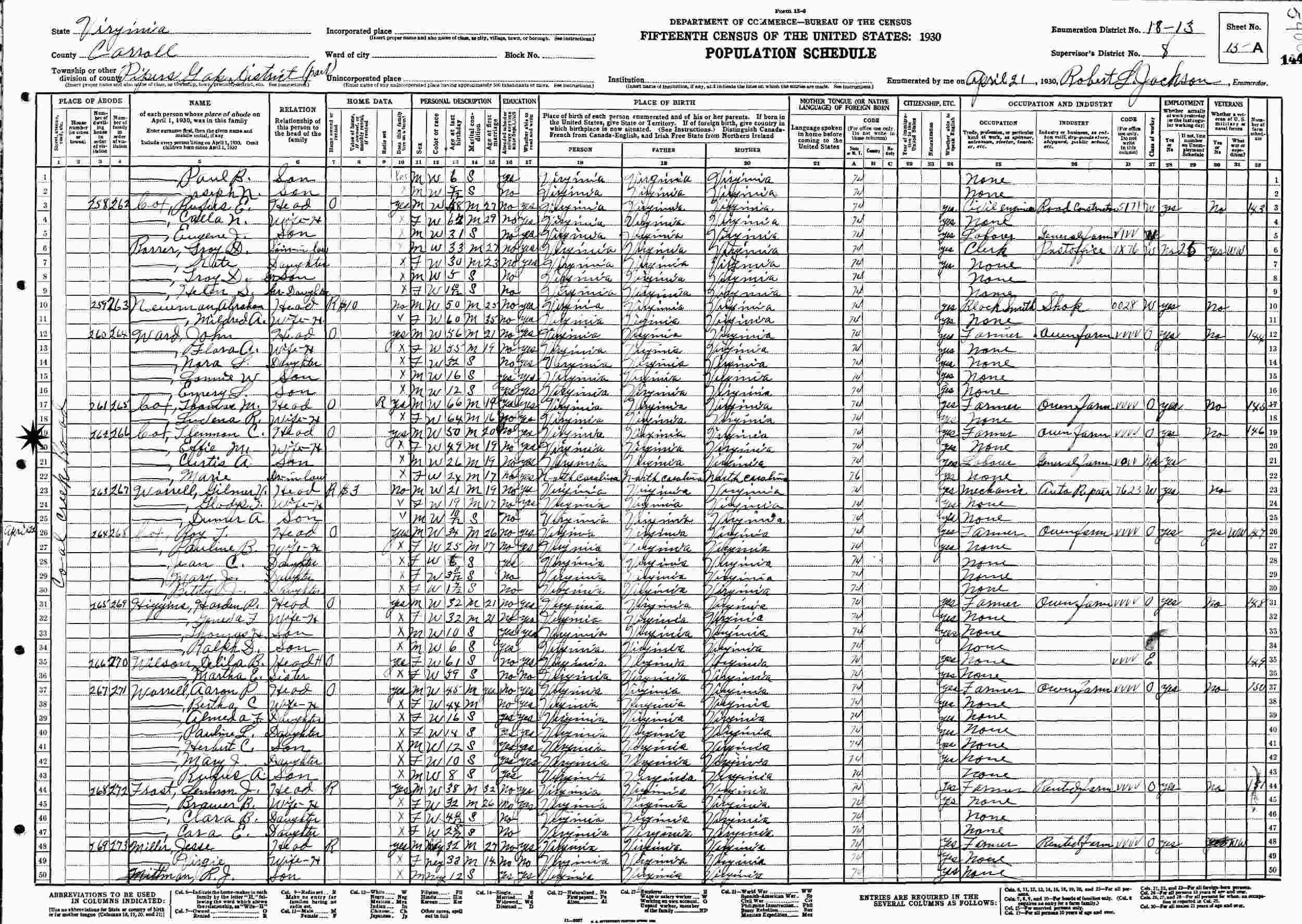 April 22, 1930 - Coal Creek Road, Supervisor's District 8, Enumeration District 18-13, Pipers Gap District, Carroll County, Virginia.