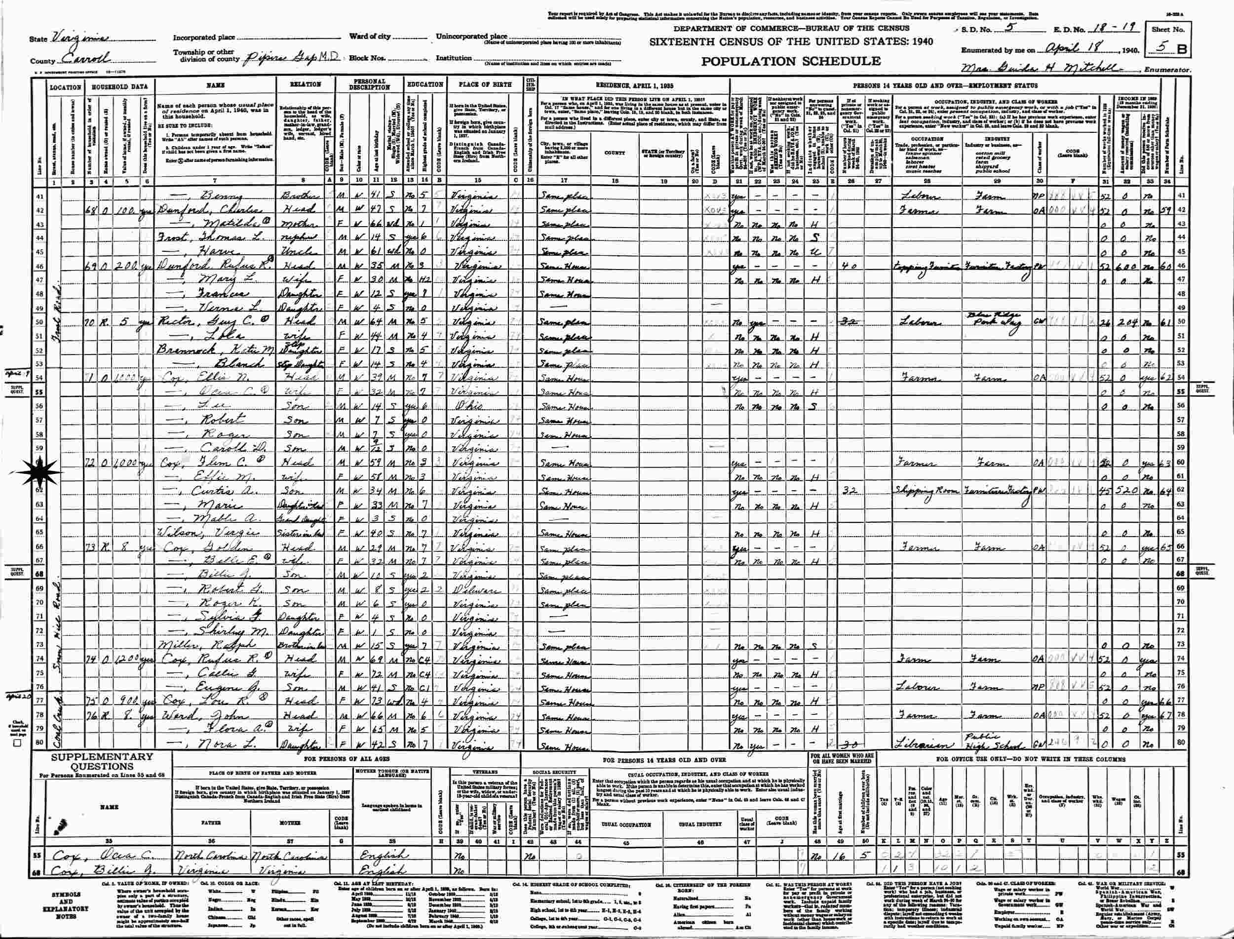 April 18, 1940 - Pipers Gap Magisterial District, Supervisor's District 5, Enumeration District 18-19, Carroll County, Virginia.