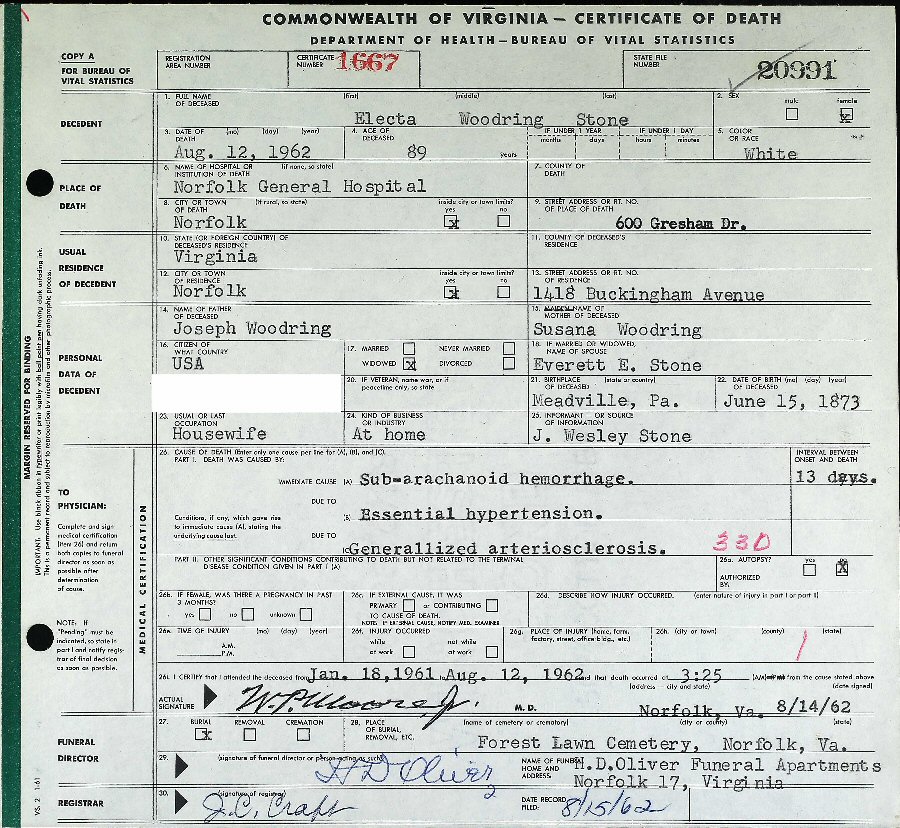 Buried: Forest Lawn Cemetery, Norfolk, Virginia.
