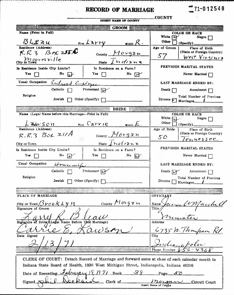 (2) Larry R Bleau February 13, 1971 in Brooklyn, Morgan County, Indiana. (Born: May 28, 1913, Meadow Creek, Summers County, West Virginia; Died: December 28, 1978, Indianapolis, Marion County, Indiana.)