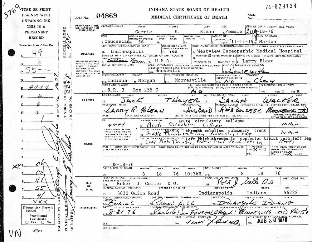 Died: August 18, 1976 in Indianapolis, Marion County, Indiana.