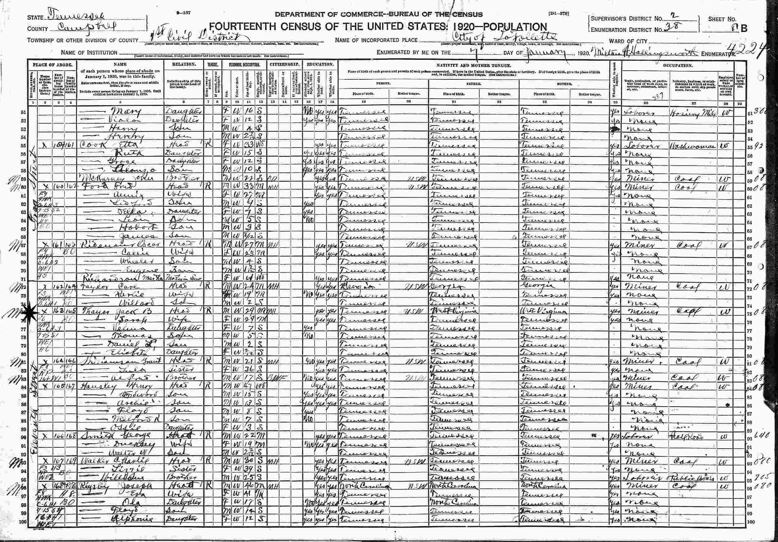 January 7, 1920 - Eleventh Street, 1st Civil District, Supervisor's District 2, Enumeration District 38, LaFollette, Campbell County, Tennessee.