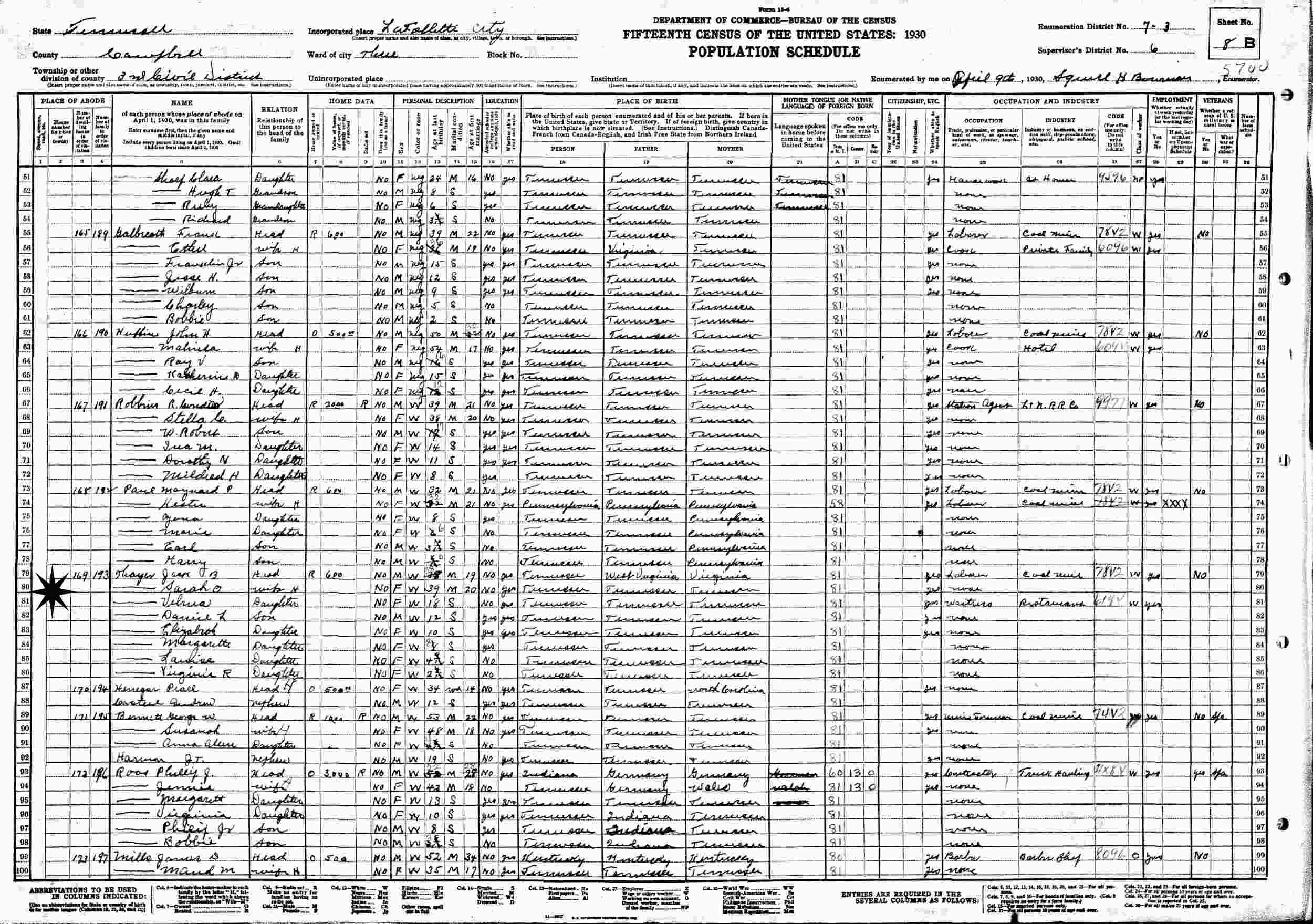 April 9, 1930 - 3rd Civil District, Ward 3, Supervisor's District 6, Enumeration District 7-3, La Follette, Campbell County, Tennessee.