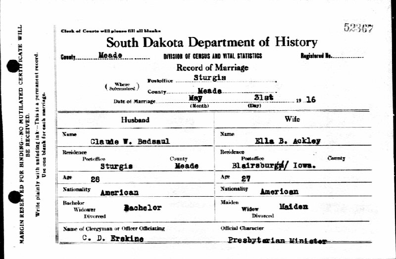Married: William Claude Bedsaul May 31, 1916 in Sturgis, Meade County, South Dakota.