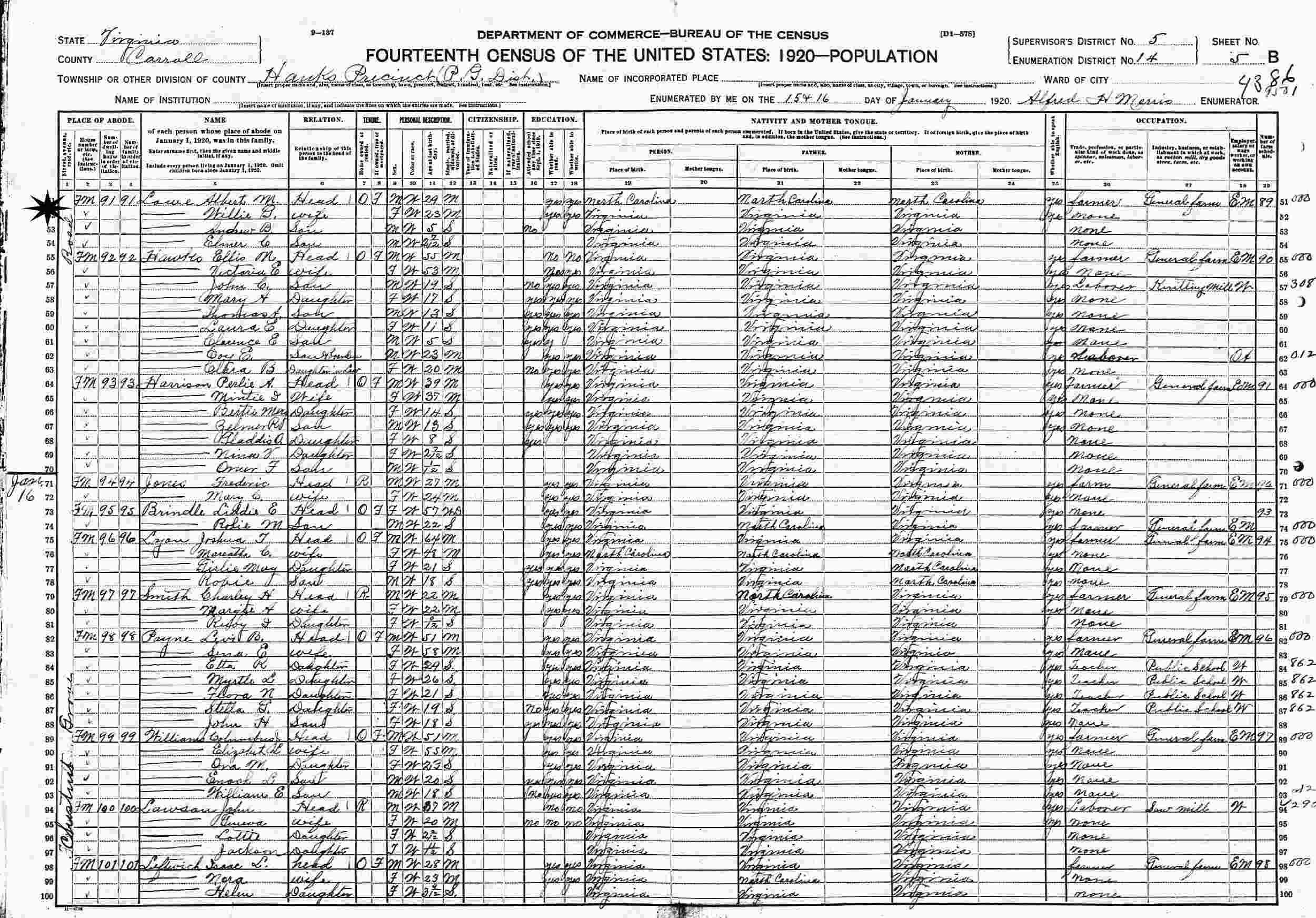 January 15, 1920 - Chestnut Grove Road, Supervisor's District 5, Enumeration District 14, Hanks Precinct, Pipers Gap District, Carroll County, Virginia.
