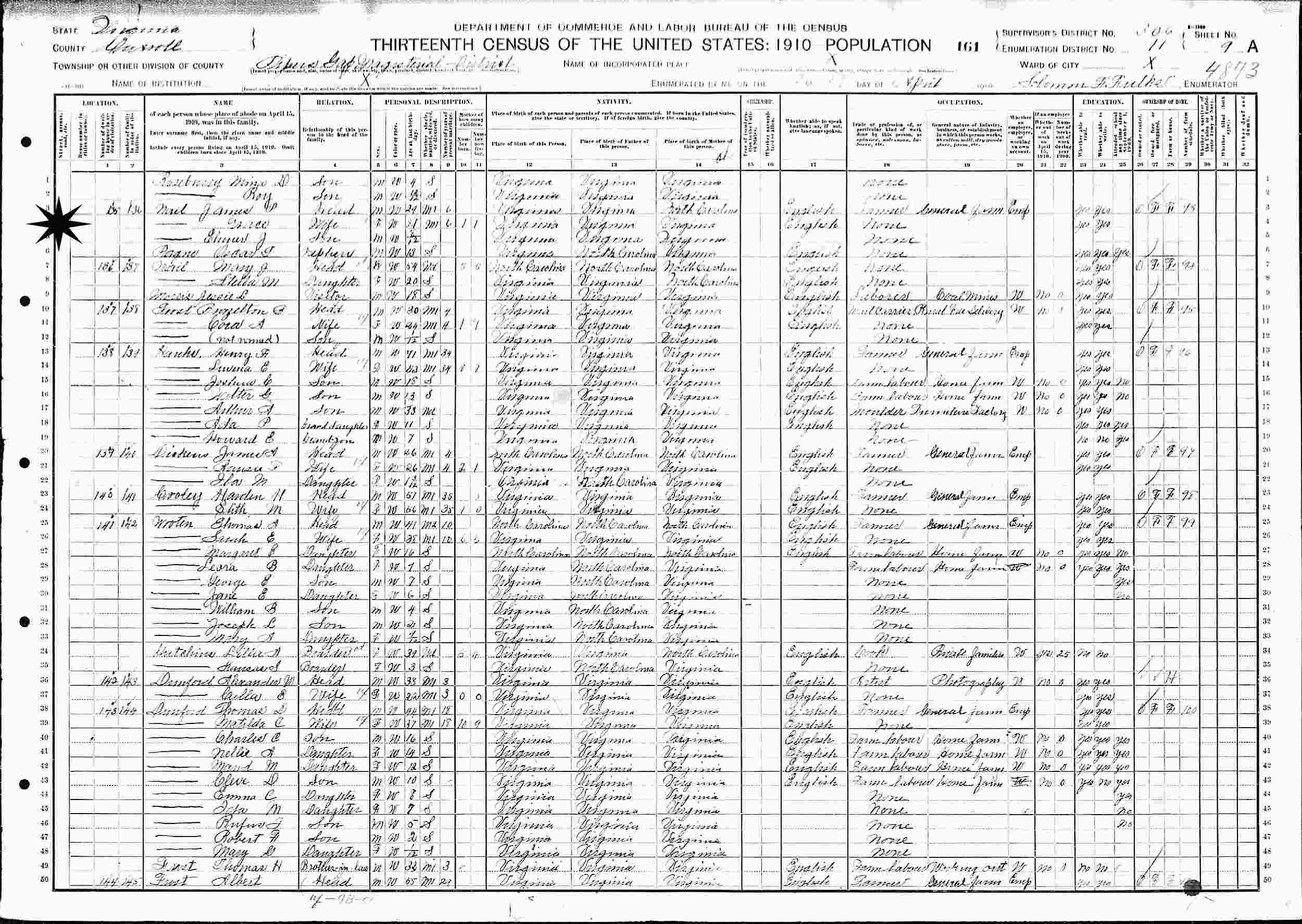 April 26-27, 1910 - Pipers Gap Magisterial District, Supervisor's District 306, Enumeration District 11, Carroll County, Virginia.
