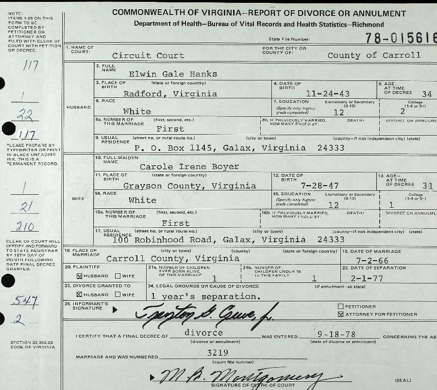 Married: (1) Carol Irene Boyer July 2, 1966 in Carroll County, Virginia.(Separation: February 1, 1977; Divorce: September 18, 1978.)