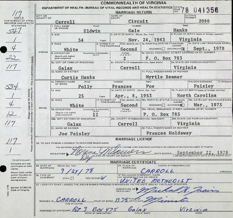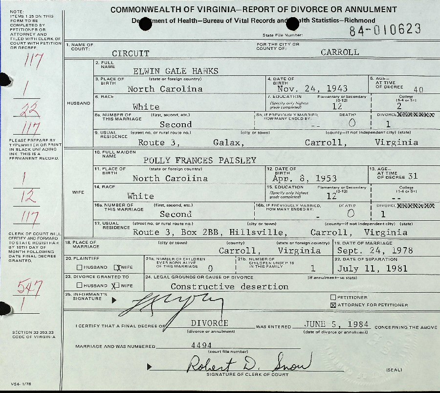 (2) Polly Frances Paisley September 24, 1978 in Carroll County, Virginia. (Separation: July 11, 1981; Divorce: June 5, 1984.) (She married (1) ? Poe.)