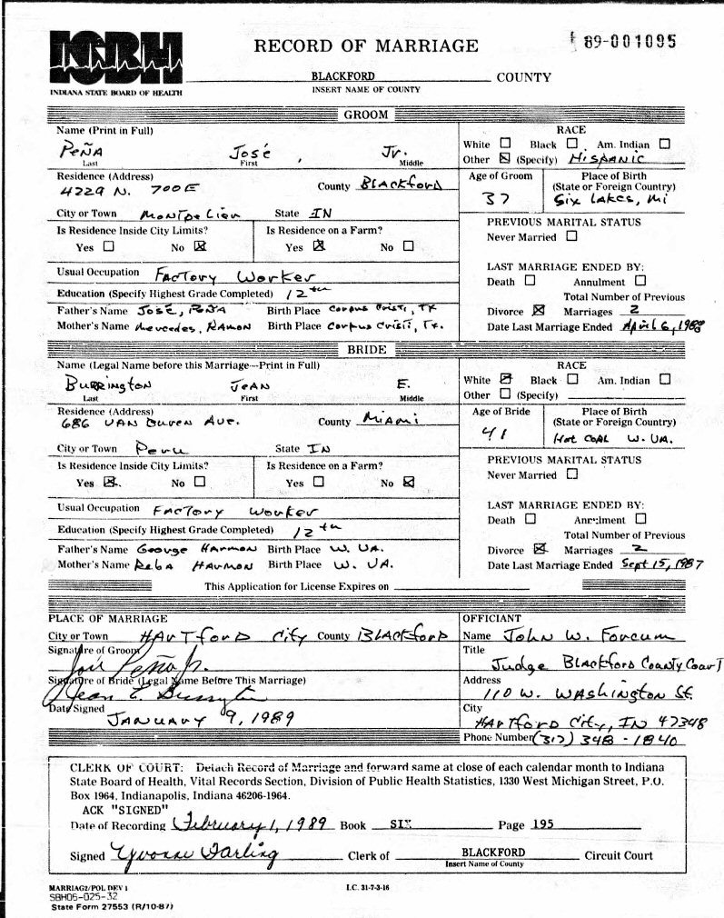 (3) Penn, Miami County, Indiana in January 9, 1989 in Hartford City, Blackford County, Indiana.