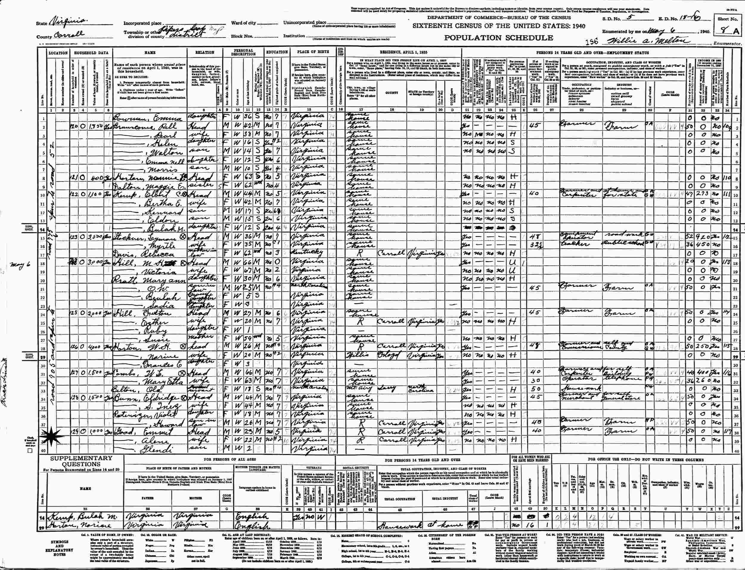 May 6, 1940 - Road 705 and Spur to Road 775, Pipers Gap, Supervisor's District 4, Enumeration District 18-16, Carroll County, Virginia.