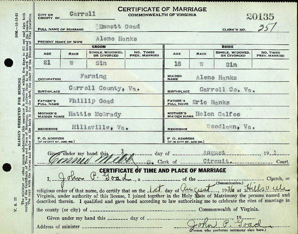 Married: Alene Delma Hanks August 1, 1936 in Hillsville, Carroll County, Virginia.
