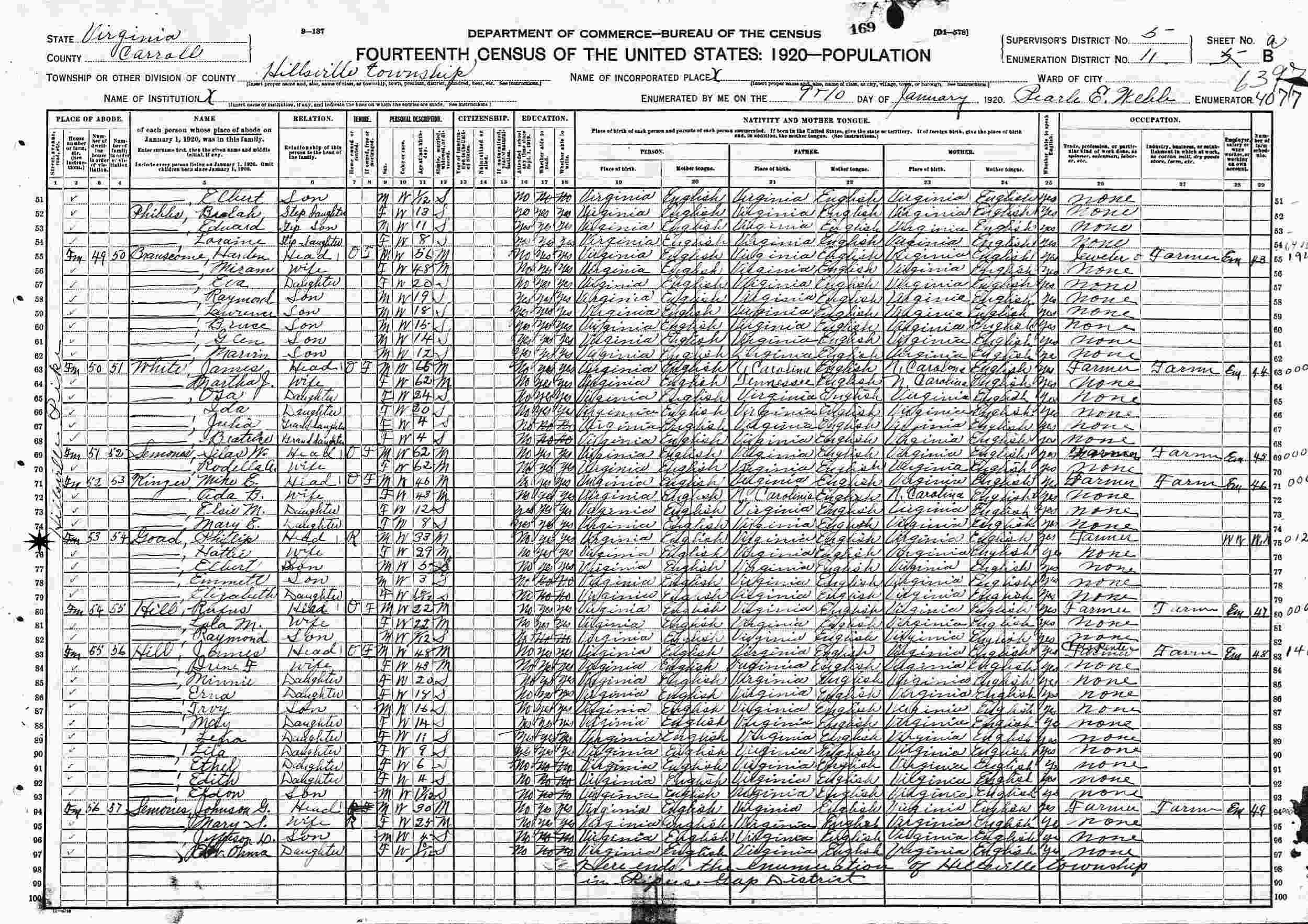 January 9-10, 1920 - Hillsville Pike, Hillsville, Supervisor's District 5, Enumeration District 11, Carroll County, Virginia.
