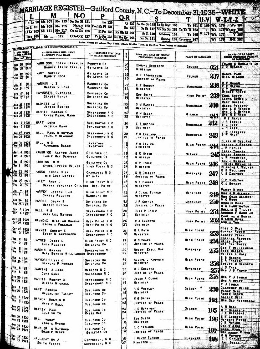 Married: Iris Love Martin June 23, 1921 in Morehead, Guilford County, North Carolina.