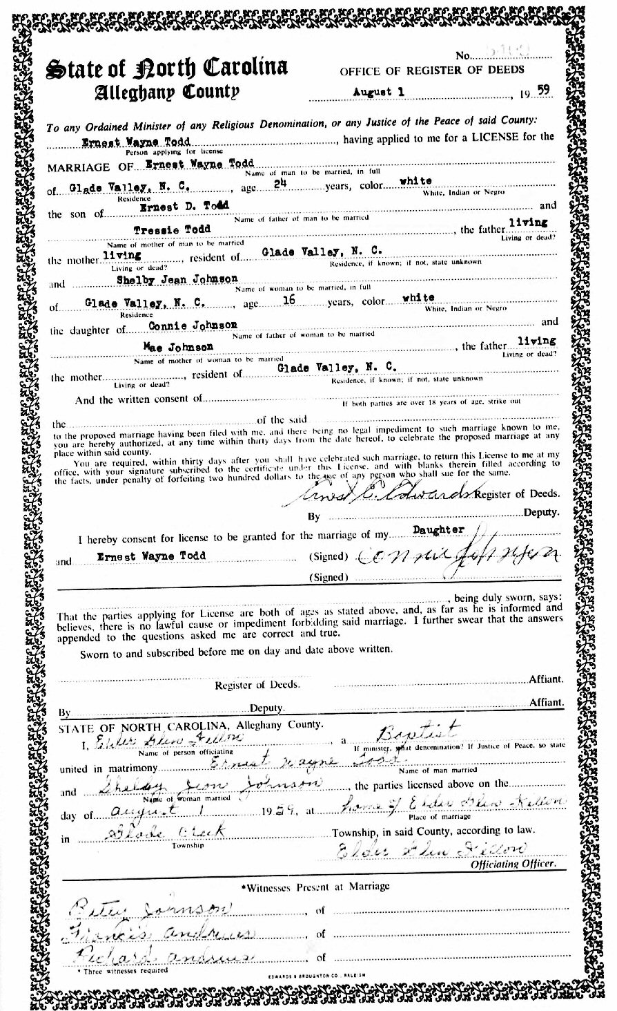 Married: (1) Shelby Jean Johnson August 1, 1959 in Alleghany County, North Carolina. (She married (2) ? Pilcher.)