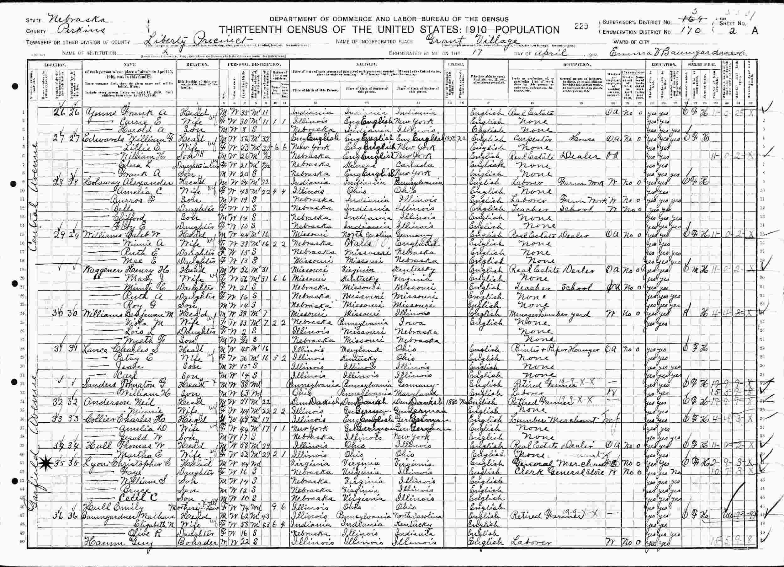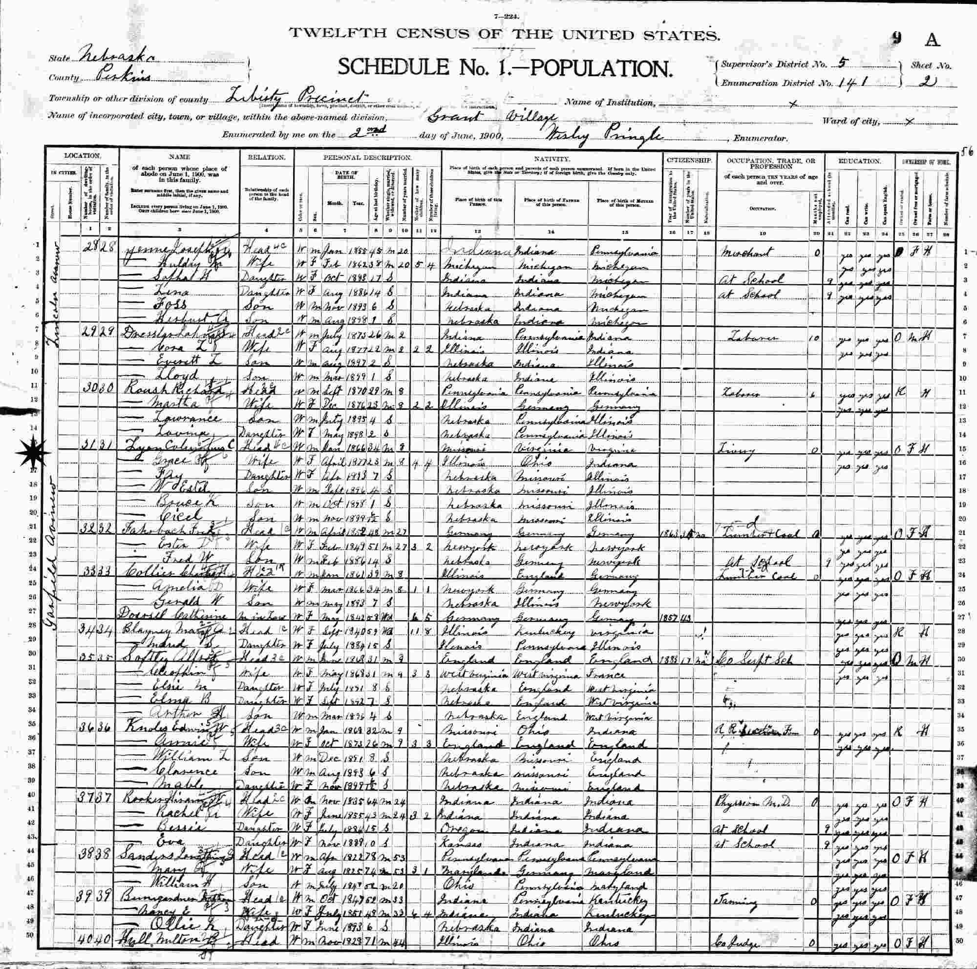 June 2, 1900 - Garfield Avenue, Supervisor's District 5, Enumeration District 141, Liberty Precinct, Grant Village, Perkins County, Nebraska.