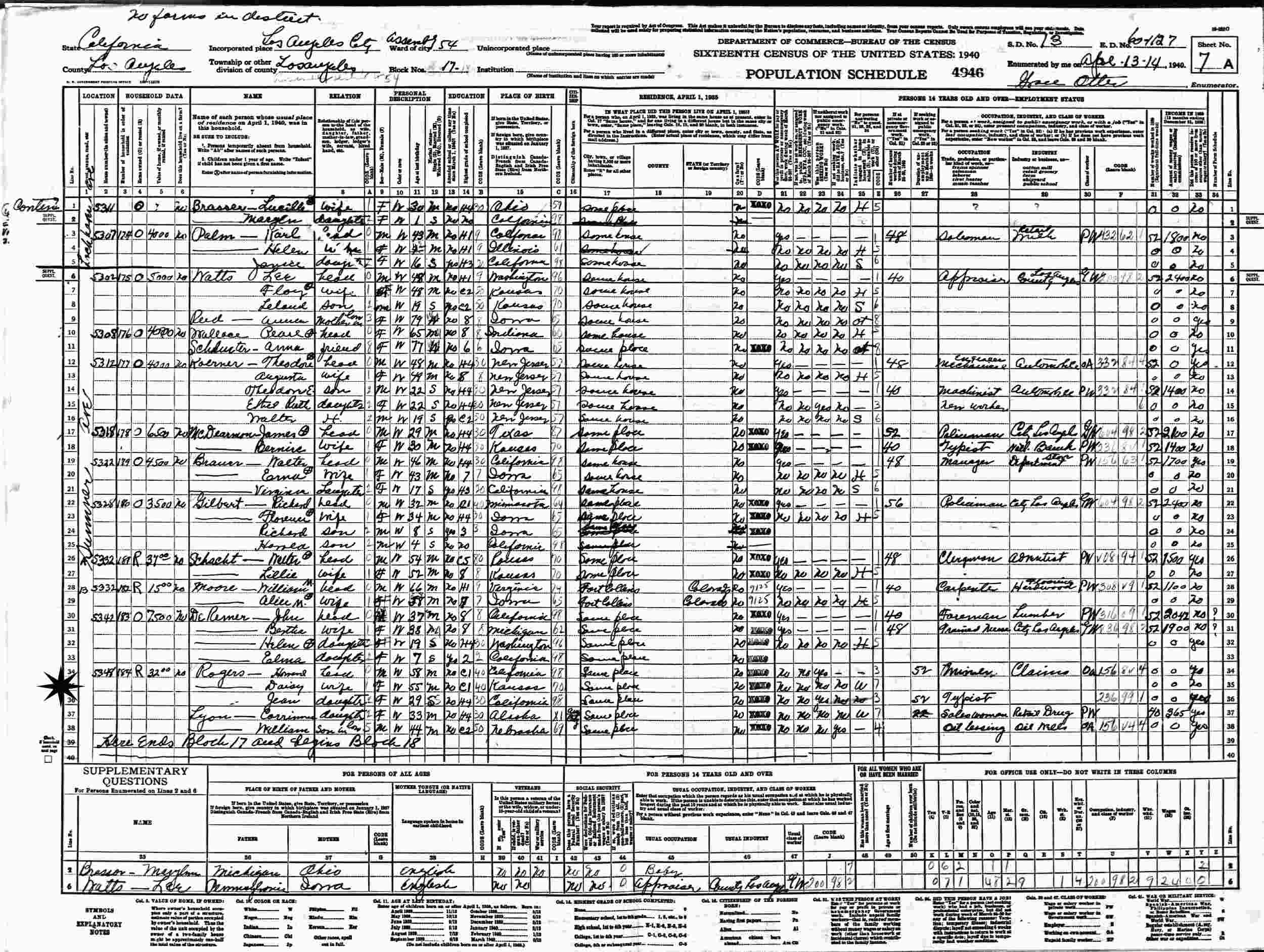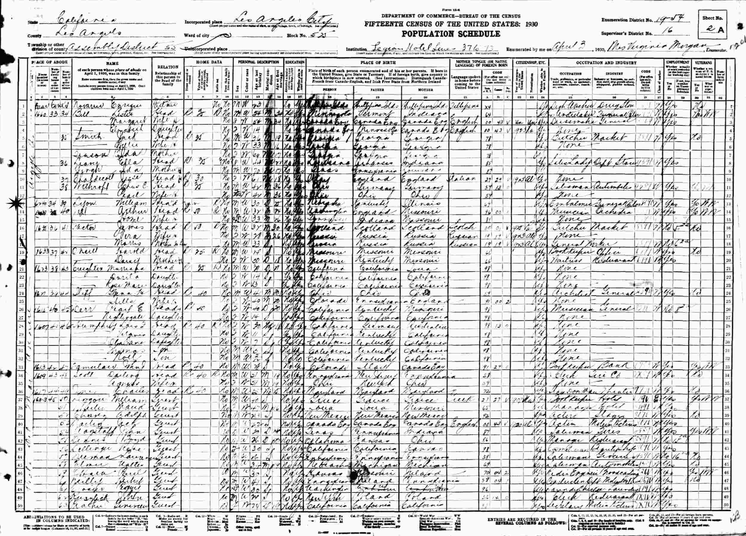 April 3, 1940 - Legion Hotel Lewes 37-73, 6240 Del Mar Avenue, Assembly District 55, Block 525, Supervisor's District 16, Enumeration District 19-54, Los Angeles, Los Angeles County, California.