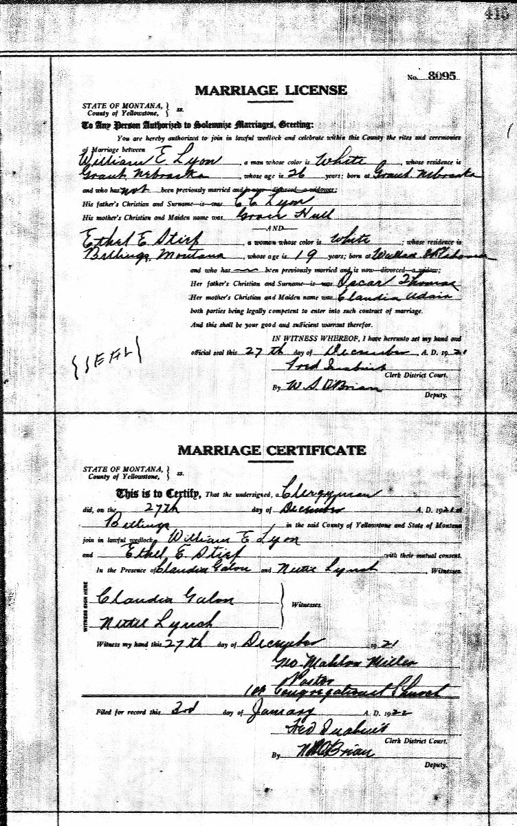 Married: (1) Ethe E THomas December 27, 1921 in Billings, Yellowstone County, Montana.