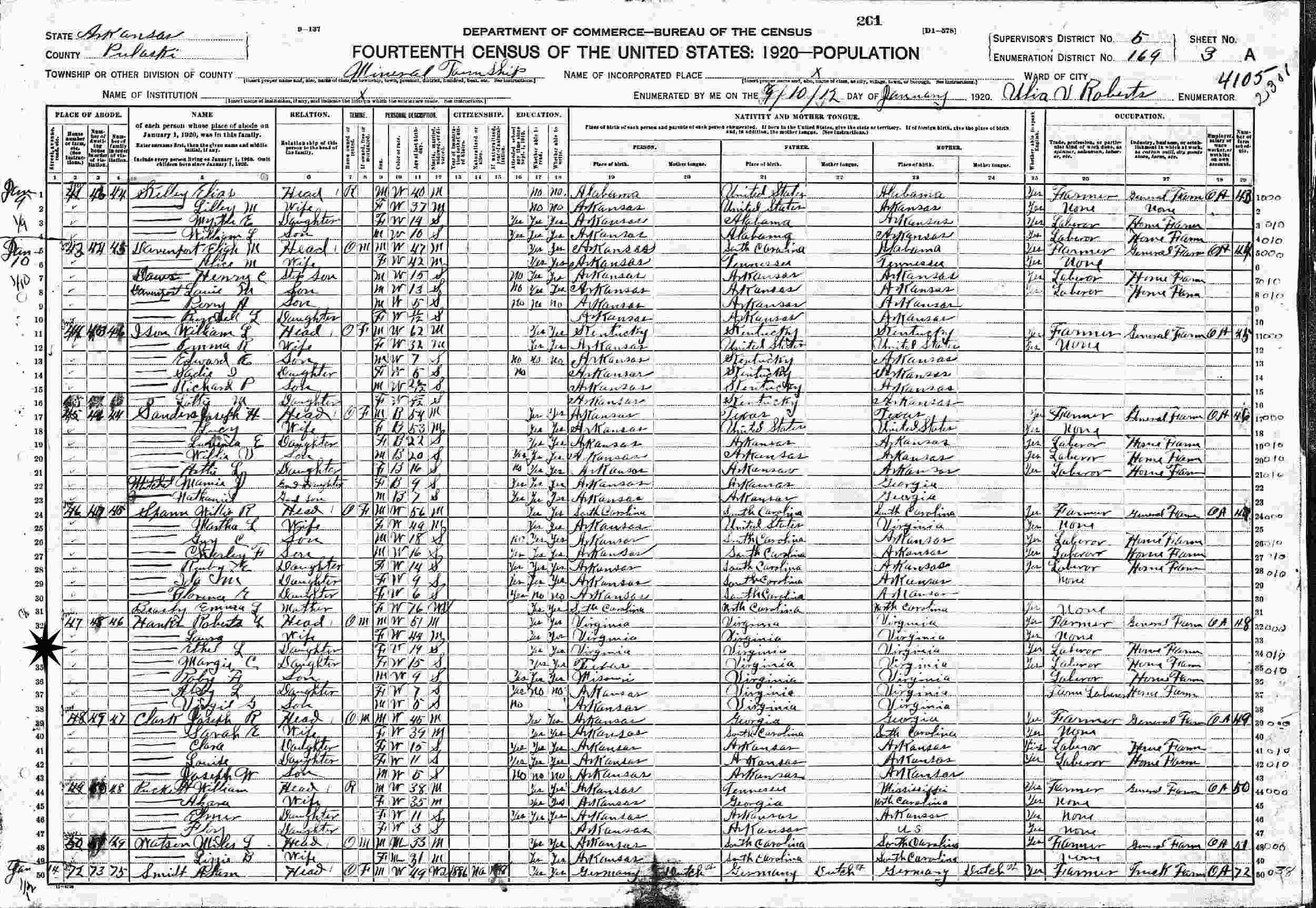 January 9-12, 1920 - Mineral Township, Supervisor's District 5, Enumeration District 169, Pulaski County, Arkansas.