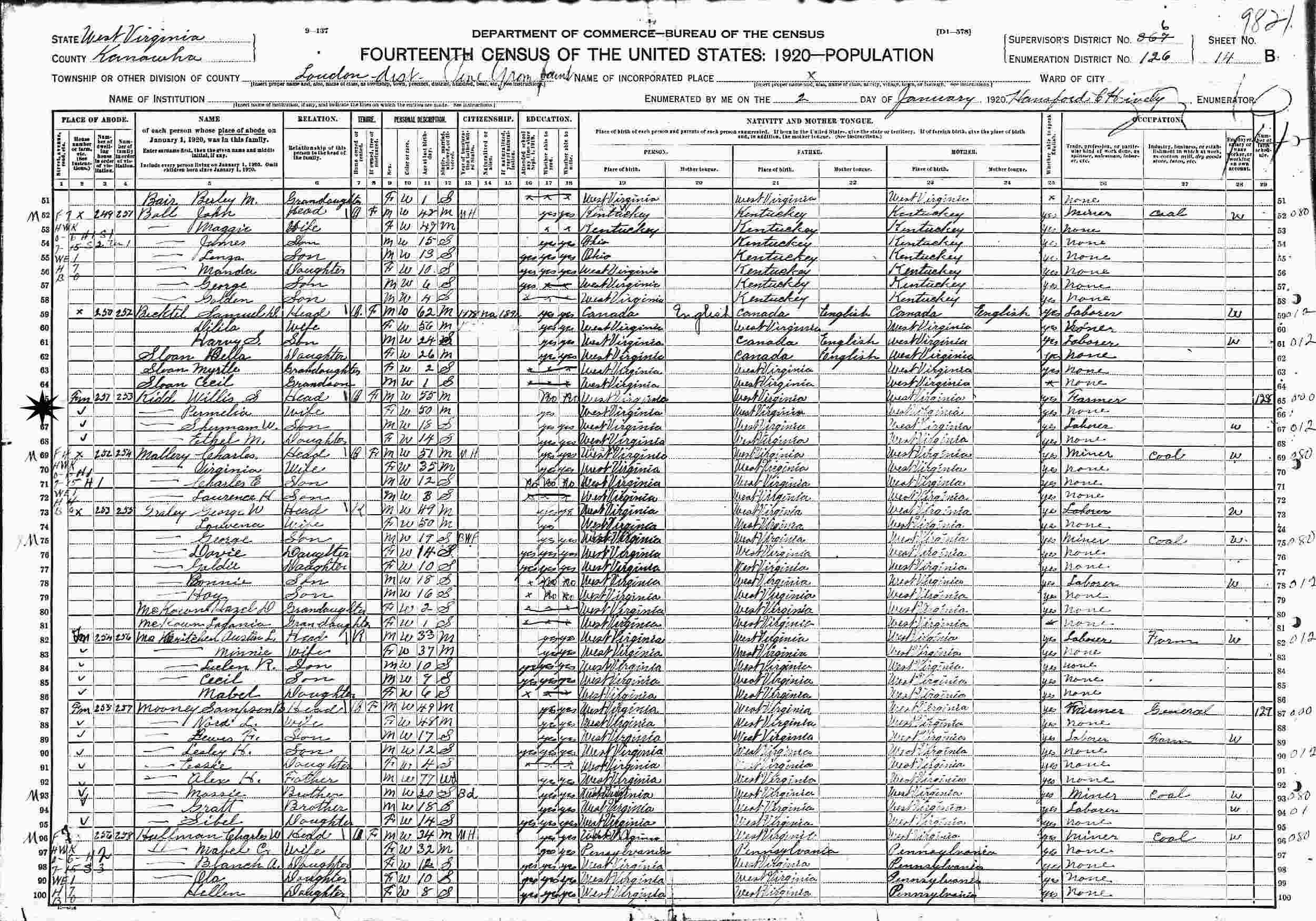 January 2, 1920 - Supervisor's District 367 (crossed out the 6) Enumeration District 126, Loudon District, Kanawha County, West Virginia.