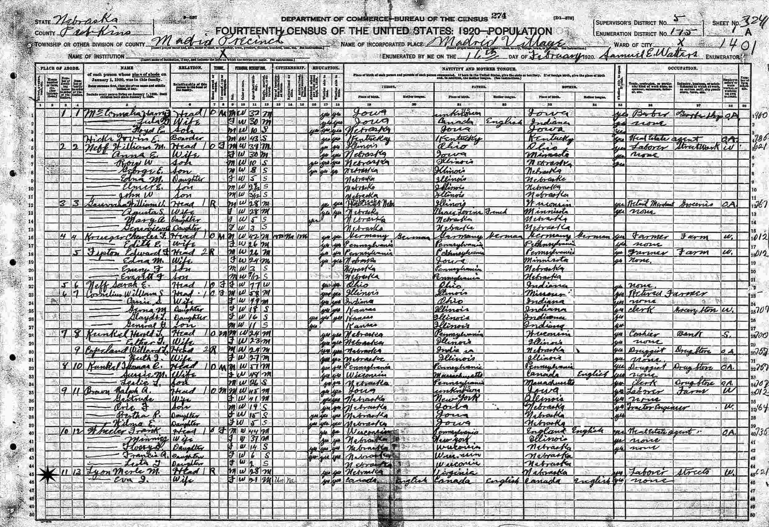 February 16, 1920 - Supervisor's District 5, Enumeration District 1-15, Madrid Village, Perkins County, Nebraska.
