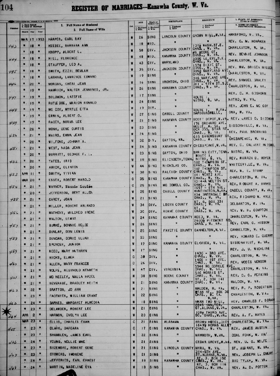 Married: Robert Lee Delawder, Sr. April 2, 1953 in Kanawha County, West Virginia. (Marriage License Issued: March 23, 1953.)