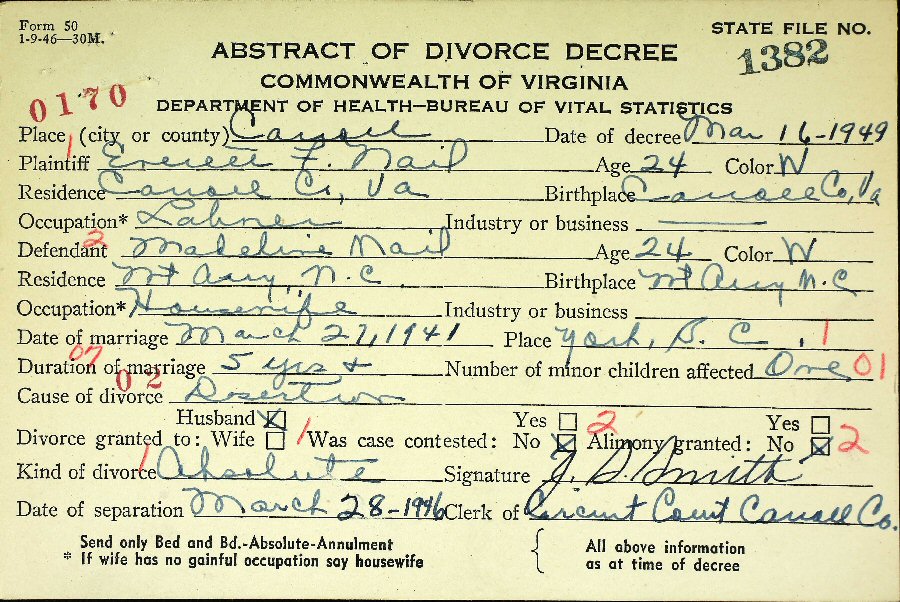 Married: (1) Mary Madeline Jessup March 27, 1941 in York County, South Carolina. (Separation: March 28, 1946; Divorce: March 16, 1949.)
