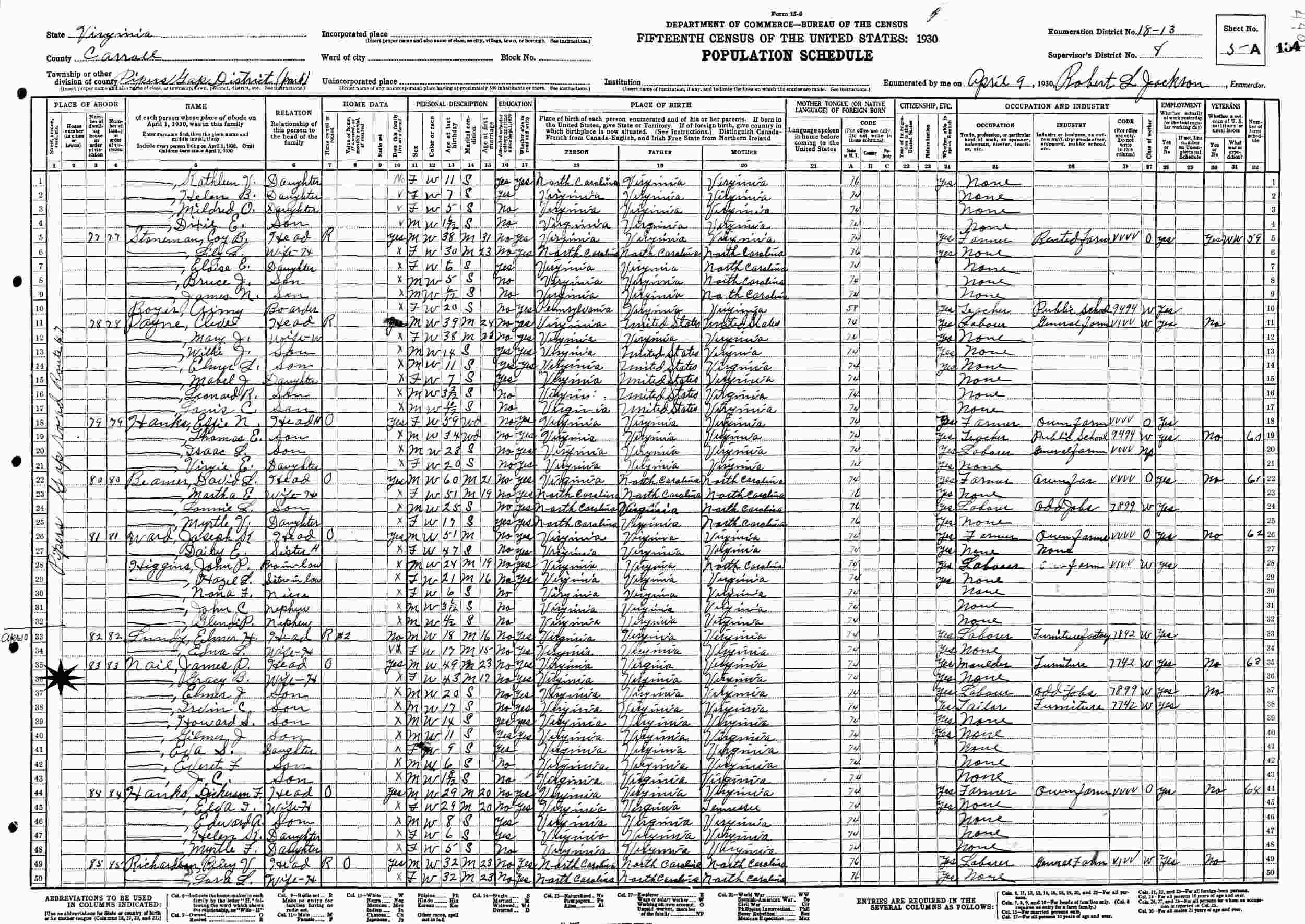 April 10, 1930 - Pipers Gap Road Route #7, Supervisor's District 8, Enueration District 18-13, Pipers Gap Magisterial District, Carroll County, Virginia.