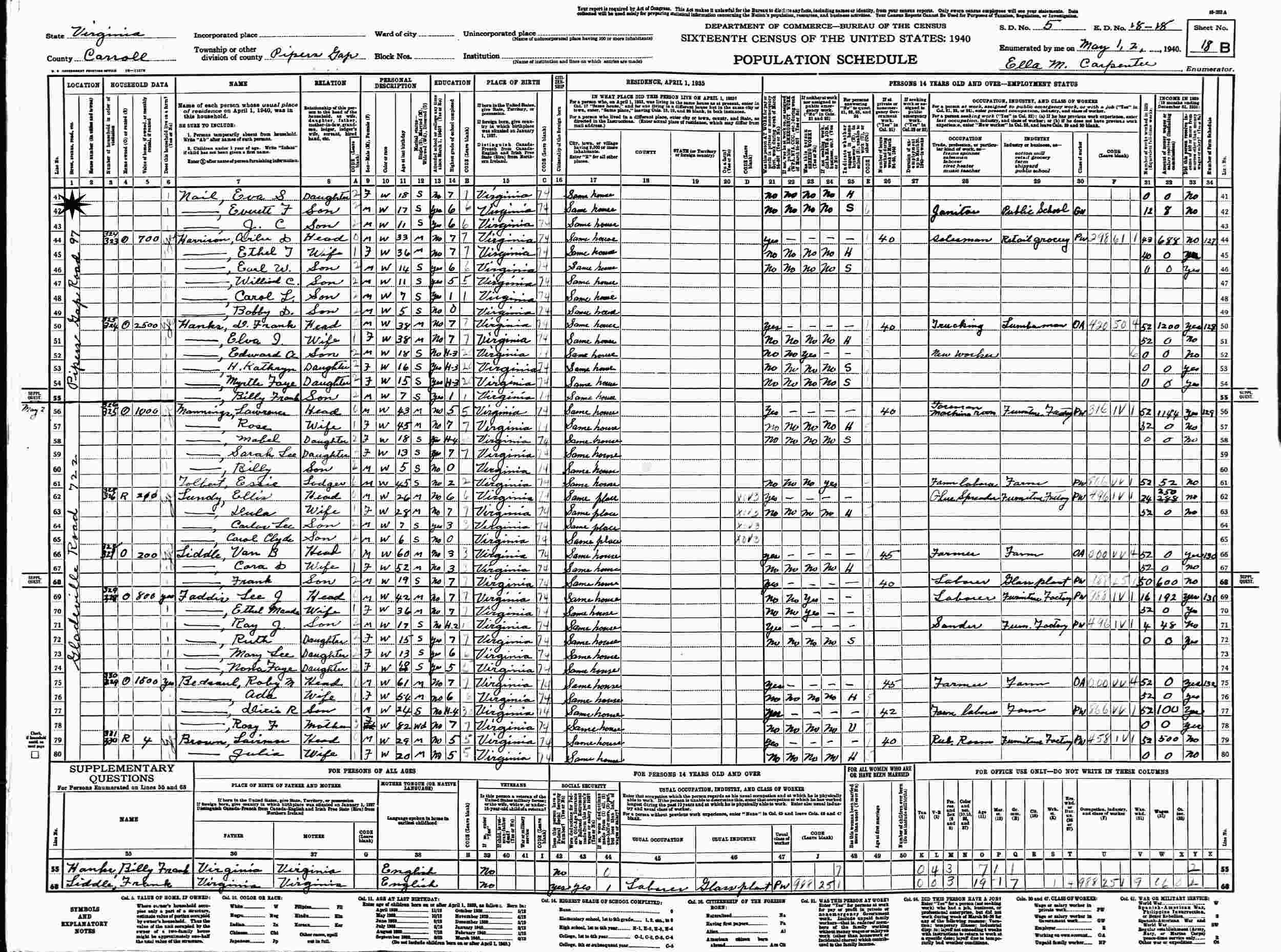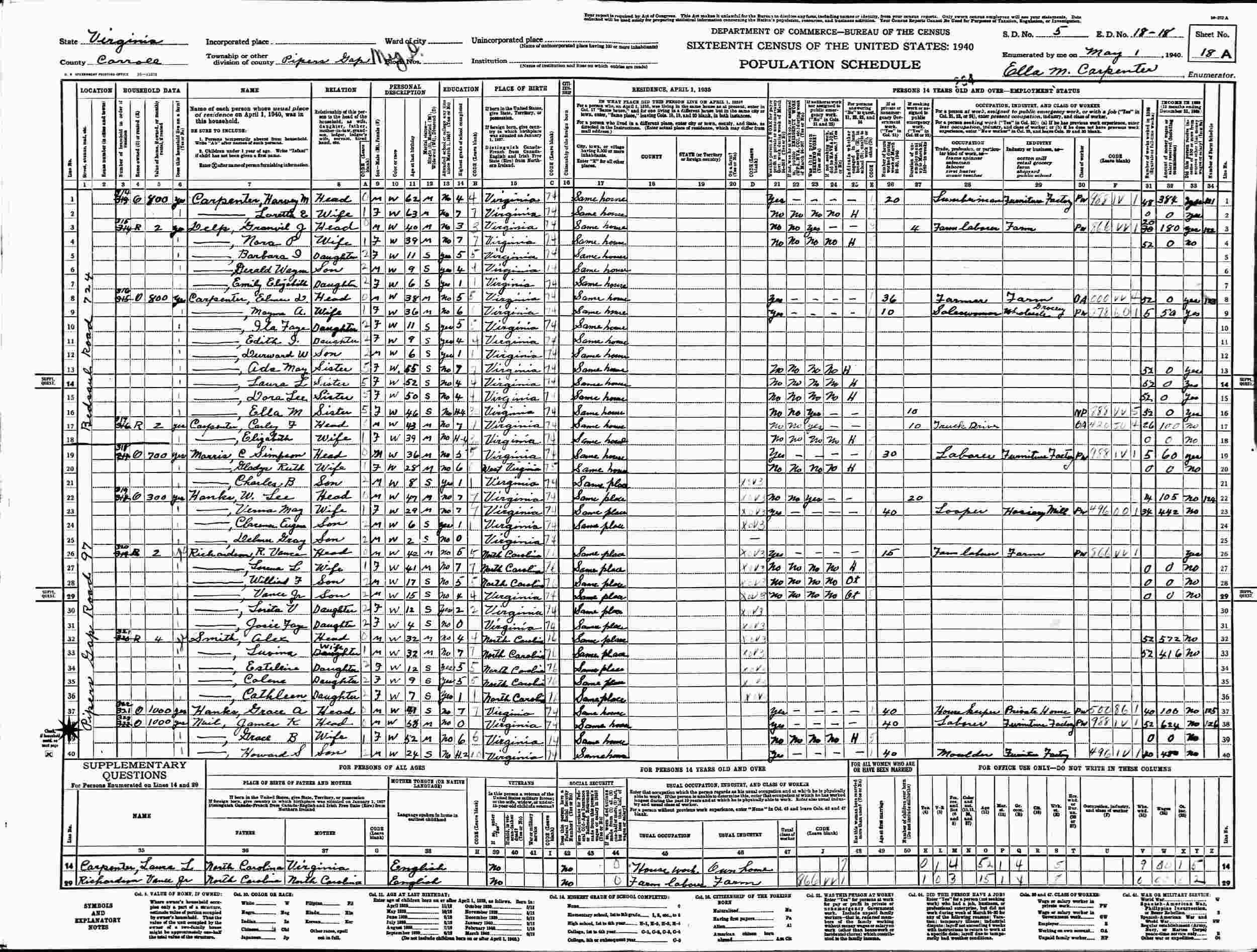 May 1-2, 1940 - Pipers Gap Road 97, Supervisor's District 5, Enumeration District 18-18, Pipers Gap, Carroll County, Virginia.