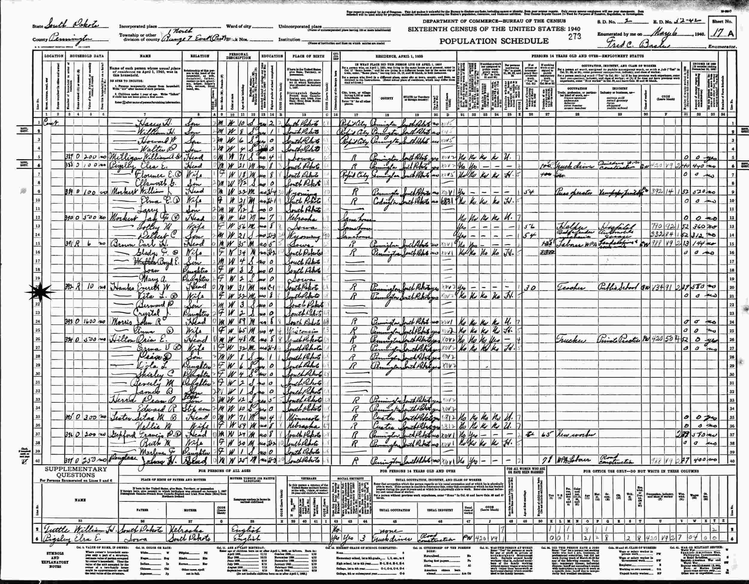May 6, 1940 - Township 1 N Range, Supervisor's District 2, Enumeration District 52-42, Pennington County, South Dakota.