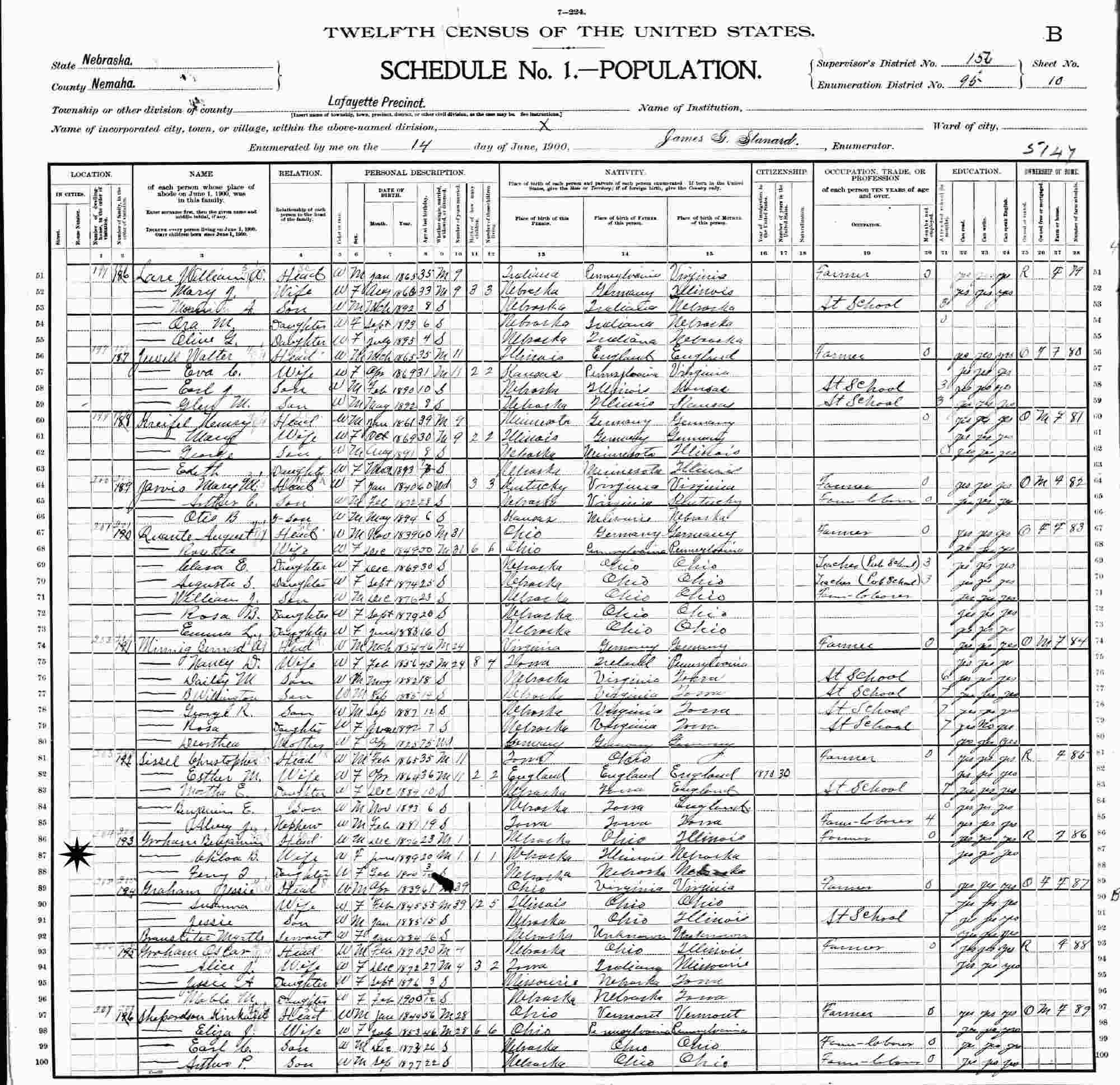 June 14, 1900 - Supervisor's District 156, Enumeration District 95, Lafayette Precinct, Nemaha County Nebraska.