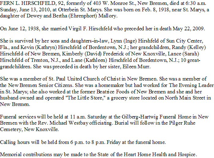 Married: Virgil Frederick Willi Hirschfeld June 12, 1938 in Auglaize County, Ohio.