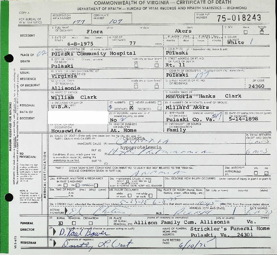 Died: June 8, 1975 in Pulaski Community Hospital, Pulaski, Pulaski County, Virginia.