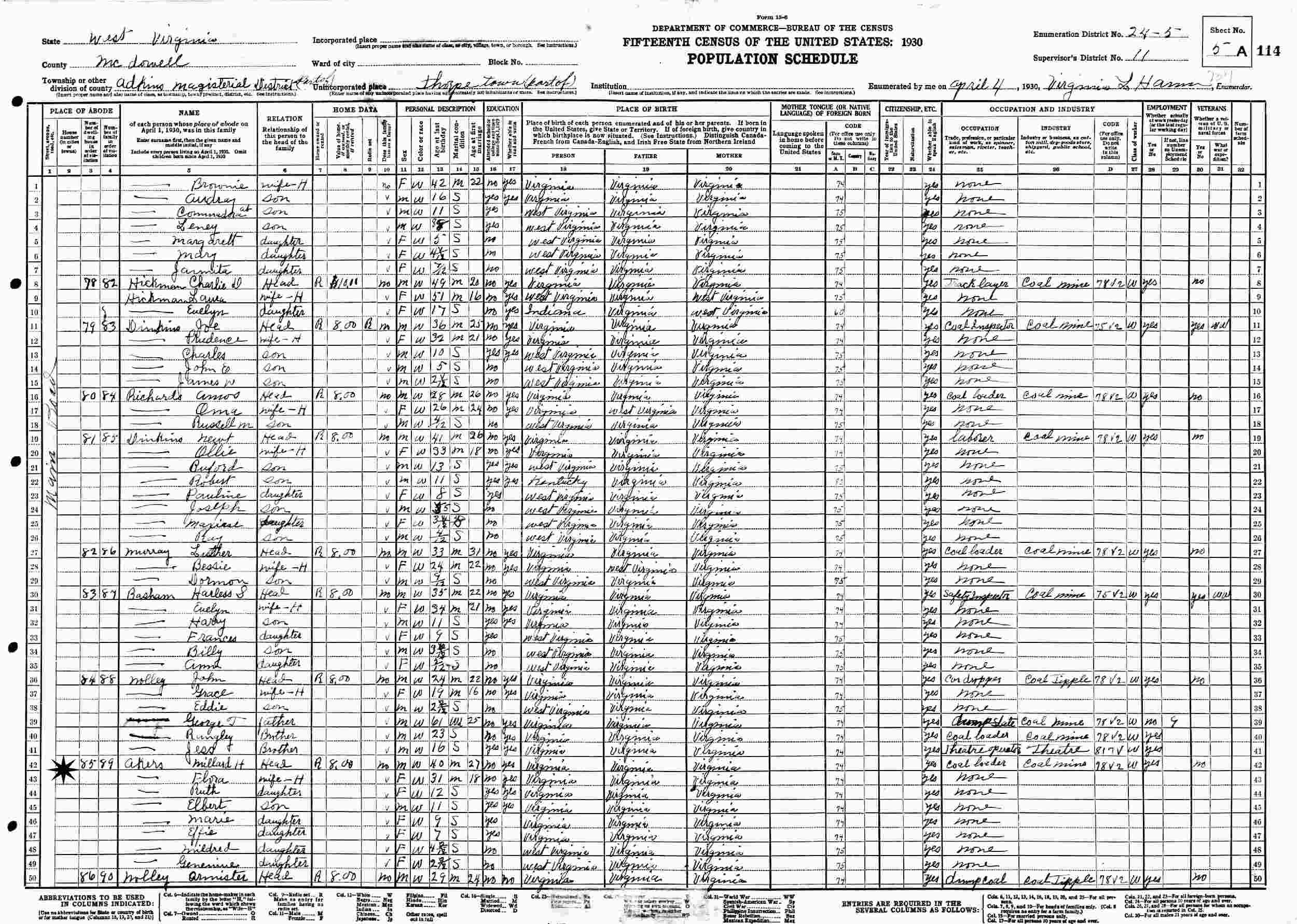 April 4, 1930 - Main Road, Supervisor's District 11, Enumeration District 24-5, Adkins Magisterial District, Thorpe Town, McDowell County, West Virginia.