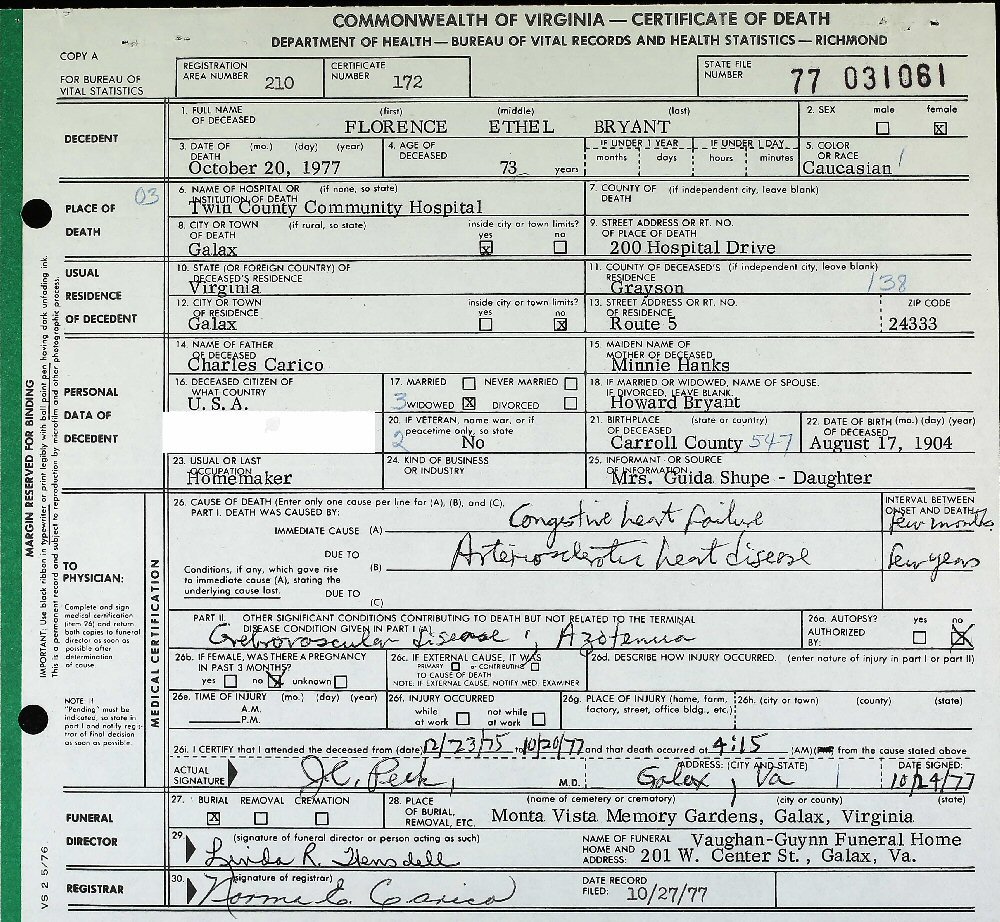 Died: October 10, 1977 in Twin County Community Hospital, Galax, Virginia.