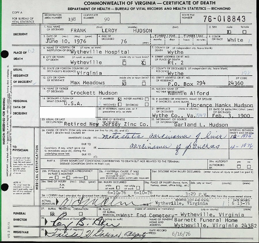 Died: June 10, 1976 in Wytheville Hospital, Wytheville, Wythe County, Virginia.