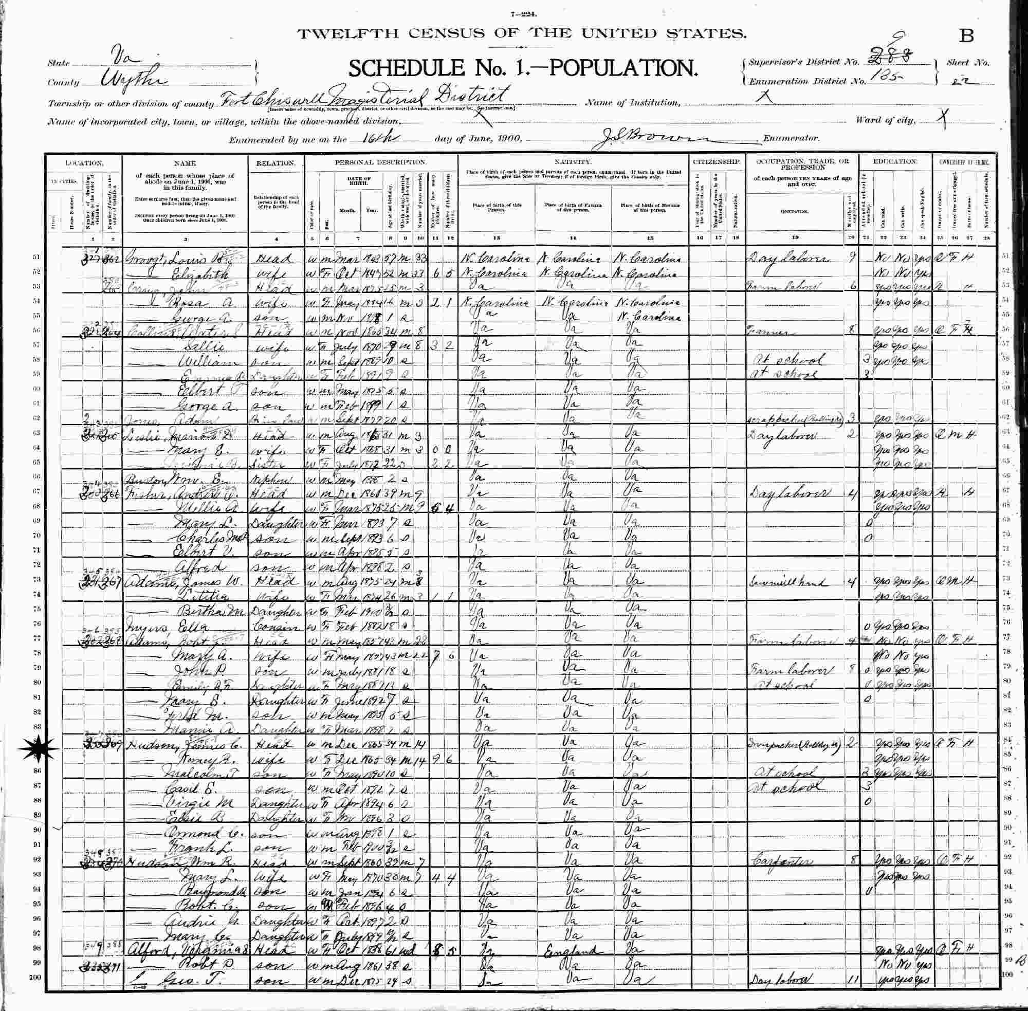June 16, 1900 - Supervisor's District 283 (crossed out to 9), Enumertion District 135, Fort Chiswell Magisterial District, Wythe County, Virginia.